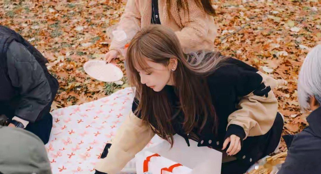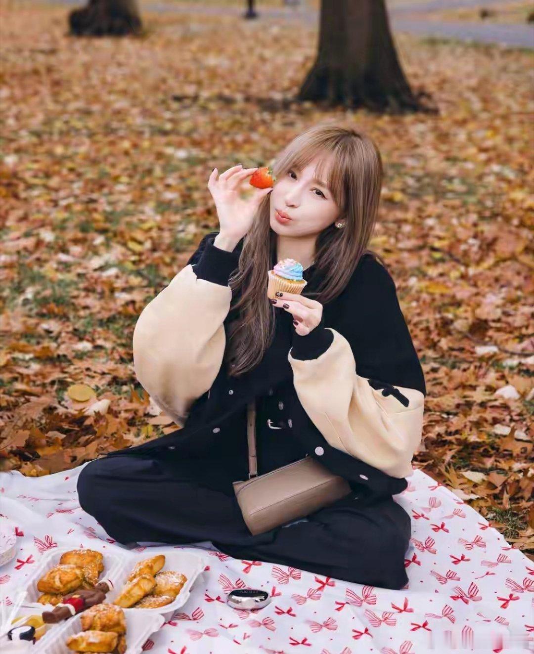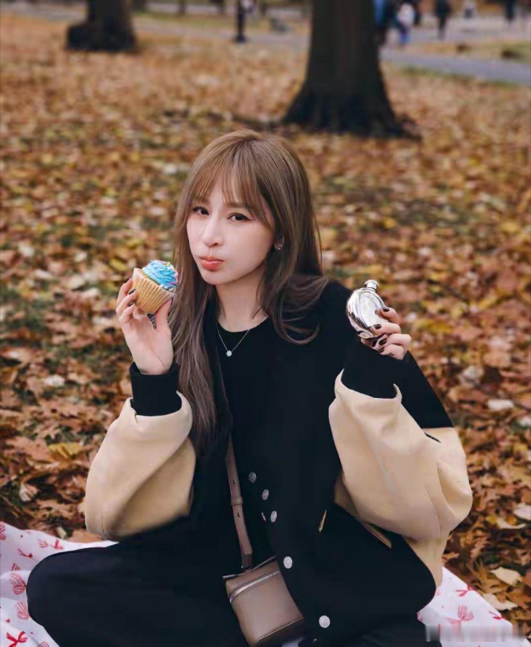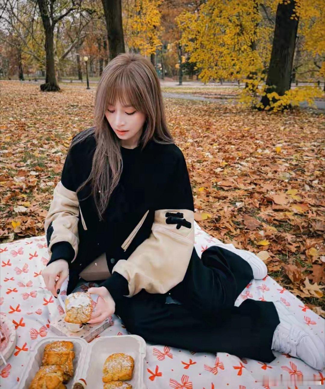 王心凌在纽约中央公园野餐,吃着美食,枫叶树下拍照,氛围拉满好美呀!!!~