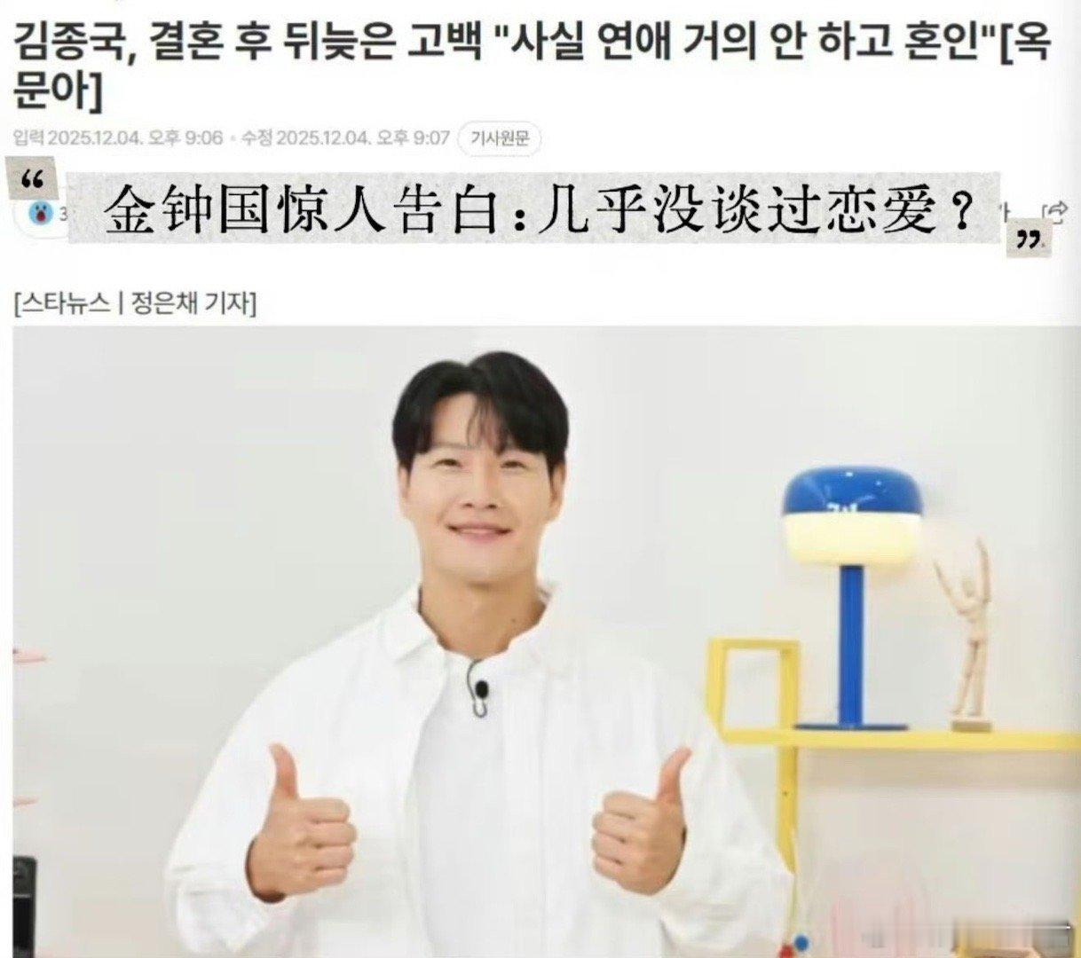 金钟国自曝先婚后爱近日,在节目《屋塔房的问题儿童们》中,金钟国表示自己几乎没谈过恋爱就结婚了,“婚后正在恋爱中”。