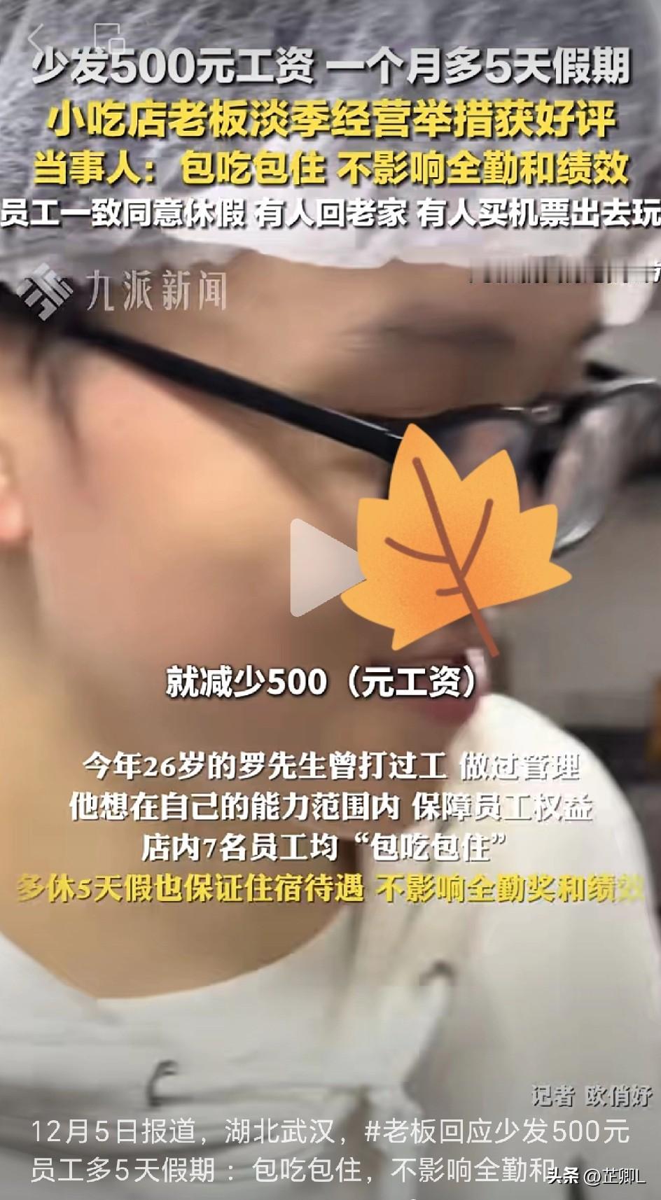 武汉老板“花钱买假期”决议引发热议:工资少500,假期多5天!店里7名员工全票通过! 你愿意用500块钱,换5天假期吗? 最近,武汉一家小吃店的老板就真的把选择权给了员工——“这个月每人少发500元工资,但可以多休5天假,加起来连休10天!” 更让人意外的是,店里7个员工,全票通过。 老板罗先生一开始还担心被网友骂,没想到视频一发,评论区直接“炸”出无数羡慕: “这不叫降薪,这叫花钱买自由!” “良心老板啊,现在真不差那500,但真缺那5天假。” “这含金量,比多发500块高多了!” “我不同意,因为没我的份!” “就想知道老板还请人吗?” “大家都认可的新型老板,祝老板发财!” 原来,这是老板和员工一起商量出来的决定。12月1日开始,大家就火速进入“休假模式”—— 有人坐车回老家见朋友,有人已经买好机票准备飞四川玩。店员小周说:“店里氛围特别好,大家都是00后,一起干活也一起聊天,每个月还能存下钱。” 老板罗先生才26岁,为了陪妻子照顾在武汉的外公外婆,今年四月才在江汉路开了这家小吃店。他自己打过工、也做过管理,特别懂员工要什么:“生意不好就裁员、好了又招人,这样大家没安全感。” 除了“可换假期”的弹性制度,他还在附近给员工租了两套电梯房当宿舍,包吃包住,水电全包,就为了让员工下班有个舒服的窝。 “以前见过有的老板让员工挤高低床,洗澡都不方便,我不想那样。”罗先生说,“我没想干多大,就想在武汉站稳脚,对家人好、对员工好,稳当过日子就行。” 很多人说,这才是“新一代好老板”——不画饼、不克扣,有话一起商量,有难一起扛,有假一起放。 不是压榨时间换利润,而是在工作和生活之间,找一个大家都舒服的“中间值”。 这样的老板,你羡慕了吗? 这样的假期,你愿意换吗? 信息来源于九派新闻,侵联删!