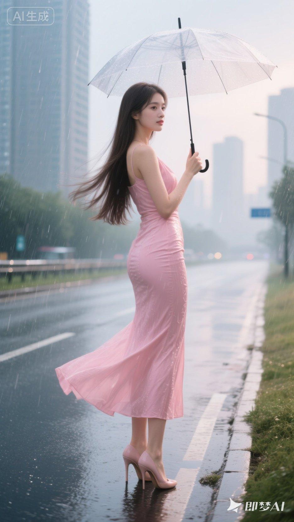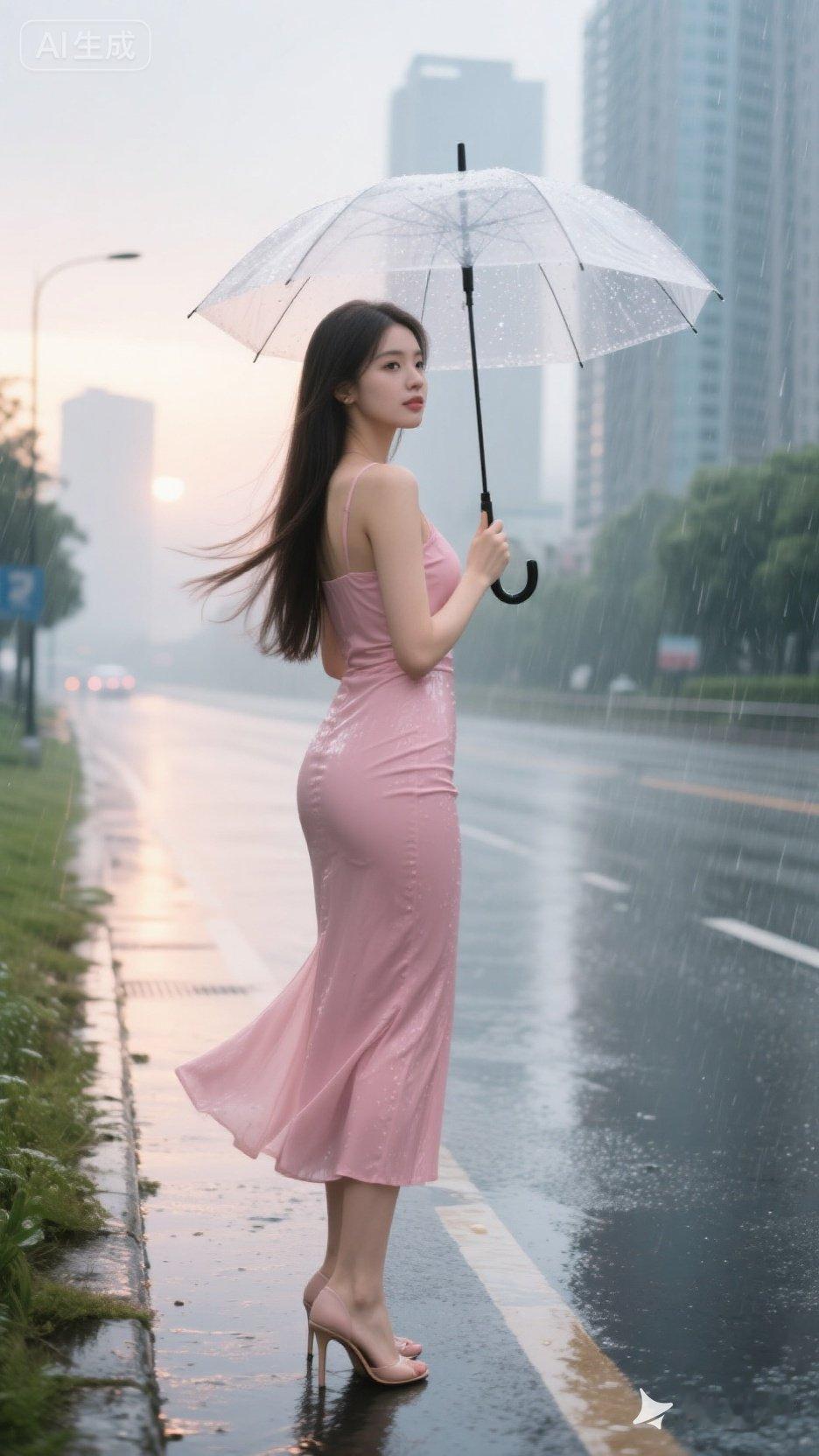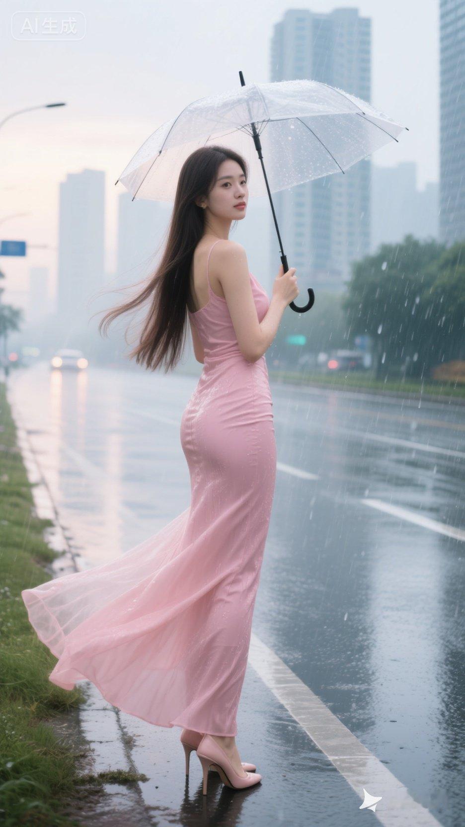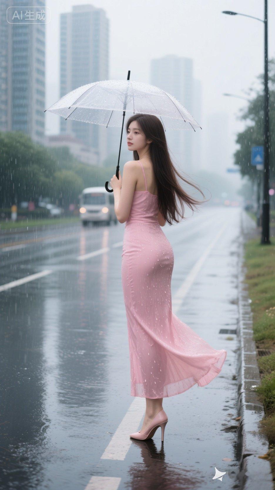 雨中漫步,粉色长裙,雨伞相伴,浪漫街景。
