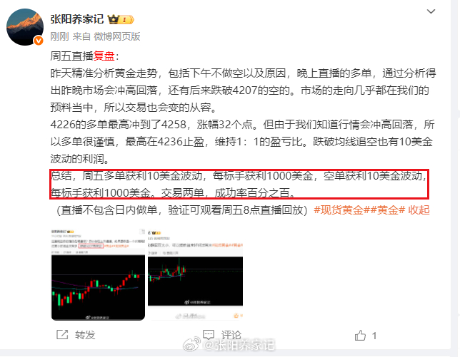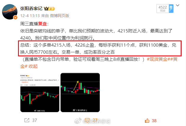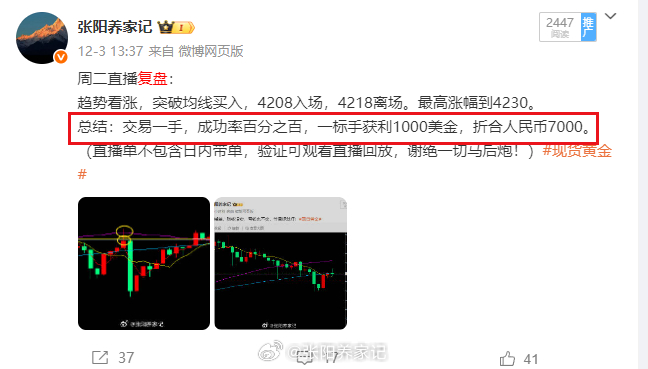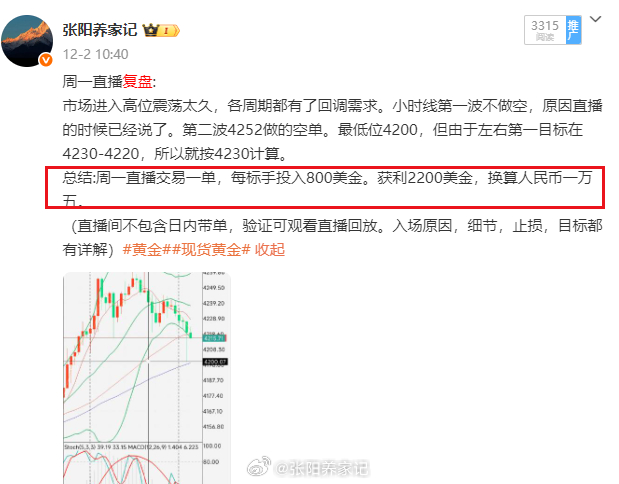 12月1日-12月5日直播复盘,成功率达到了100%从周一开始,每天的行情,包括波动点位,支撑、压力,走势都在直播中有讲。而结果也让人很惊喜。本周共交易6单,成功率100%,每标手获利7300美金,折合人民币50000元这就是技术面的魅力,通过技术分析得出结论,精准做单,由于直播时长有限,所以单量相对比较少,大家也可通过V+入群,日内单子会更多一些。所以交易市场最注重结果,不是谁更会吹牛,直播单,每单可观看直播回放验证,包括为什么做单,走势,方向,买卖点都有详细分析。