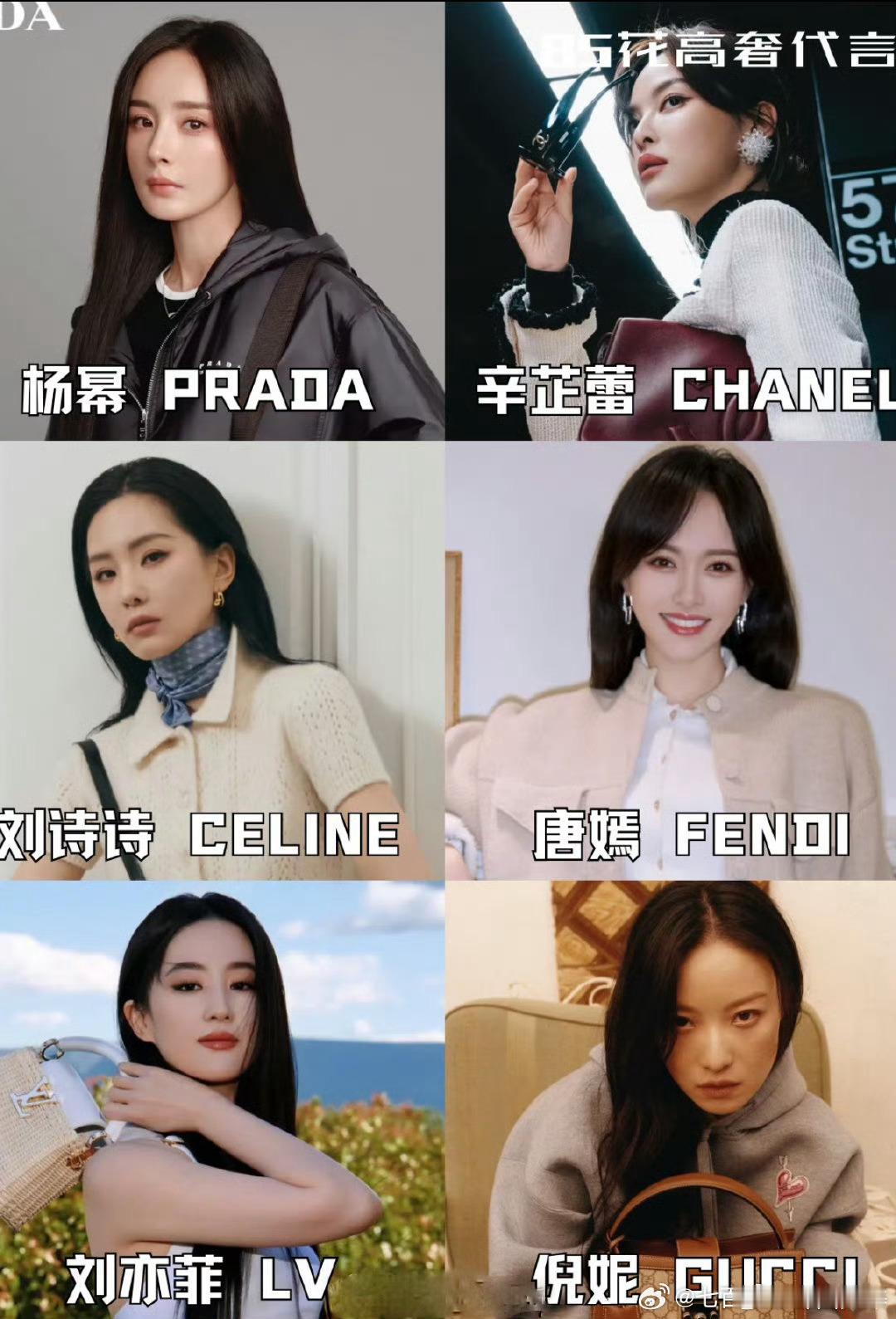 85花各自的奢牌85花奢牌 85花与成衣奢牌的合作动态:杨幂合作Prada,辛芷蕾关联Chanel,刘亦菲搭档LV,倪妮适配Gucci,刘诗诗衔接Celine,唐嫣匹配Fendi,张小斐携手巴黎世家。