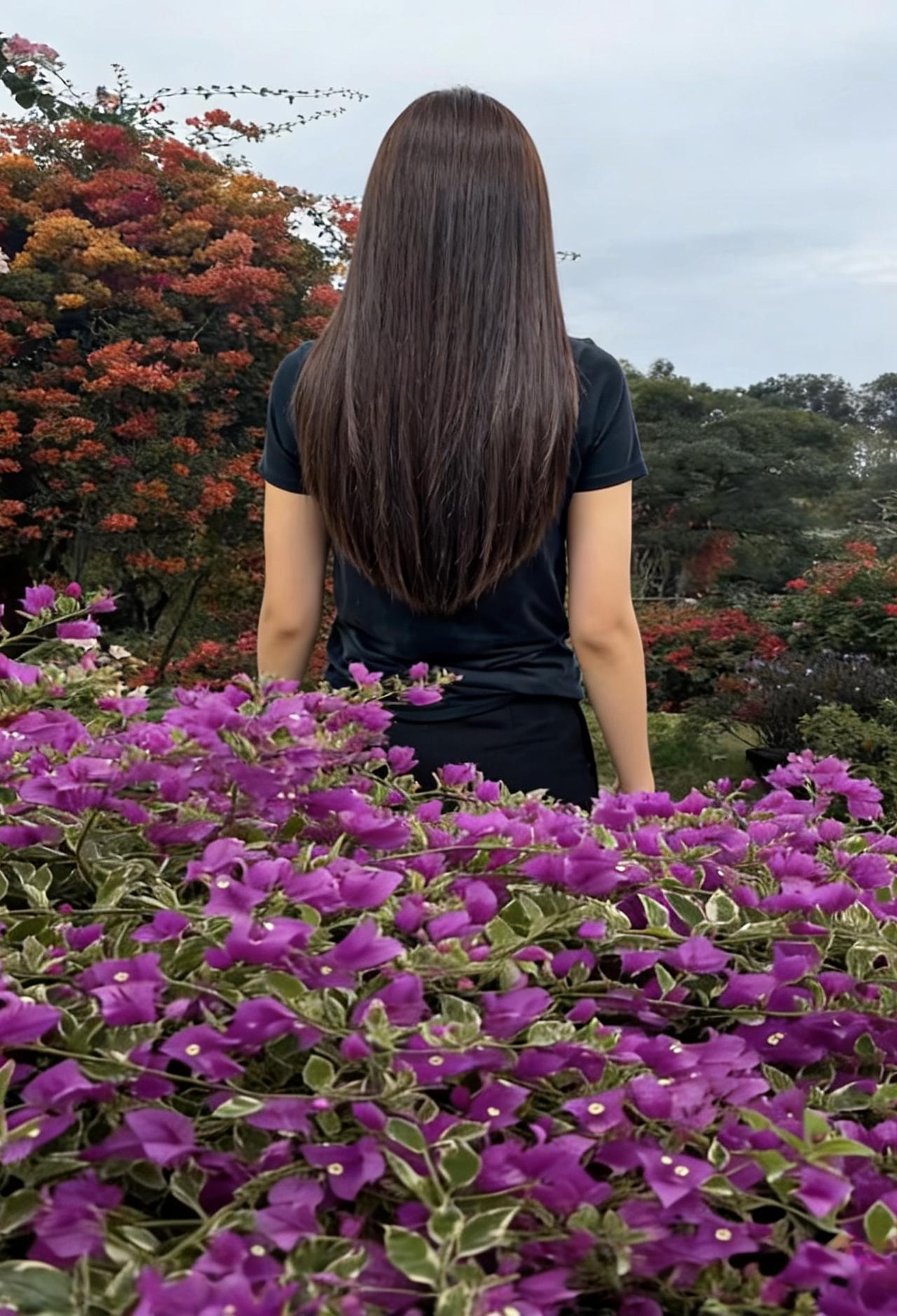 花把所有的艳 都堆在你身后: 紫的浪、红的火 粉色的笑颜 你垂着的发 是未梳理的春 把这团热,梳成了 淡淡的烟 ~ 那些想攀你肩的花 都停在半程 怕惊碎,你背影里 藏着的,那片 浅蓝的天