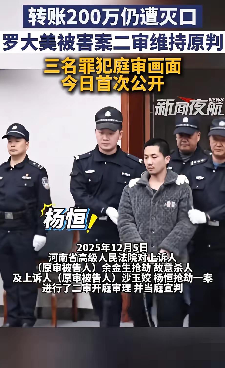 媒体都看不下去了,直接曝光了杨恒的面容。好多人都觉得,没有杨恒,罗大美就不会死。这个案子就不会成,因为四次约罗大美的都是他,也是因为他和罗大美的关系,罗大美才去的。余金生和沙玉娇根本不认识罗大美。 可是杨恒却被判的最轻,这让不光是罗大美的家人,甚至是广大网友都意难平。或许是这个原因,媒体直接曝光了现场的照片,杨恒的面容清晰可见。 我觉得杨恒以后就算出来,也社会性死亡了。 这起案子里最让人膈应的点,就是杨恒的特殊角色。他不是路人,不是偶然卷入的旁观者,是罗大美信任的熟人,是把受害者一步步推向深渊的引路者。四次邀约,次次都打着朋友的旗号,靠着这份情谊卸下了罗大美的防备,余金生和沙玉娇才能顺利实施后续的恶行。 没有这份熟人滤镜,罗大美不可能轻易赴约,更不会落得那样的结局。从案件的整个链条来看,杨恒是当之无愧的关键一环,是整个悲剧的起点。可判决结果却和他的作用完全脱节,最轻的量刑和公众心里的预期形成了巨大反差,也难怪罗大美家人会崩溃,网友会集体炸锅。 媒体选择曝光杨恒面容,其实也是民意的一种折射。正常情况下,媒体会顾及涉案人员的隐私,可这次却直接打破了惯例。说到底,是大众的意难平攒到了顶点,是大家觉得法律层面的惩戒没到位,只能用舆论的方式补上这一课,让他为自己的行为付出额外的代价。 有人说曝光面容是侵犯隐私,可换个角度想想,罗大美失去的是生命,他的家人要承受一辈子的伤痛,这些又该找谁去讨?杨恒靠着朋友的信任行不义之事,本身就已经把自己的道德底线踩得稀碎。法律的判决有其专业考量,可能是考虑了他在案件中的具体行为、认罪态度等因素,但公众的愤怒,更多是源于情理上的失衡。 所谓社会性死亡,对杨恒来说其实是必然。就算刑满释放,他也没法再回到正常的生活里。身边人的指指点点,陌生人的鄙夷目光,还有自己心里的愧疚枷锁,都会跟着他一辈子。毕竟这世上没有不透风的墙,他的所作所为早就被钉在了舆论的耻辱柱上,没人会愿意和一个背刺朋友、间接葬送他人性命的人产生交集。 法律的尺度和人心的标尺,有时候确实会出现偏差。法律追求的是严谨的证据和条文适配,可大众在意的是朴素的公平和道义。这起案子之所以引发这么大争议,本质就是两种评判标准的碰撞。杨恒的轻判或许有法理依据,但在情感和道义层面,他永远没法得到谅解。 各位读者你们怎么看?欢迎在评论区讨论。 罗大美 红罗大美案