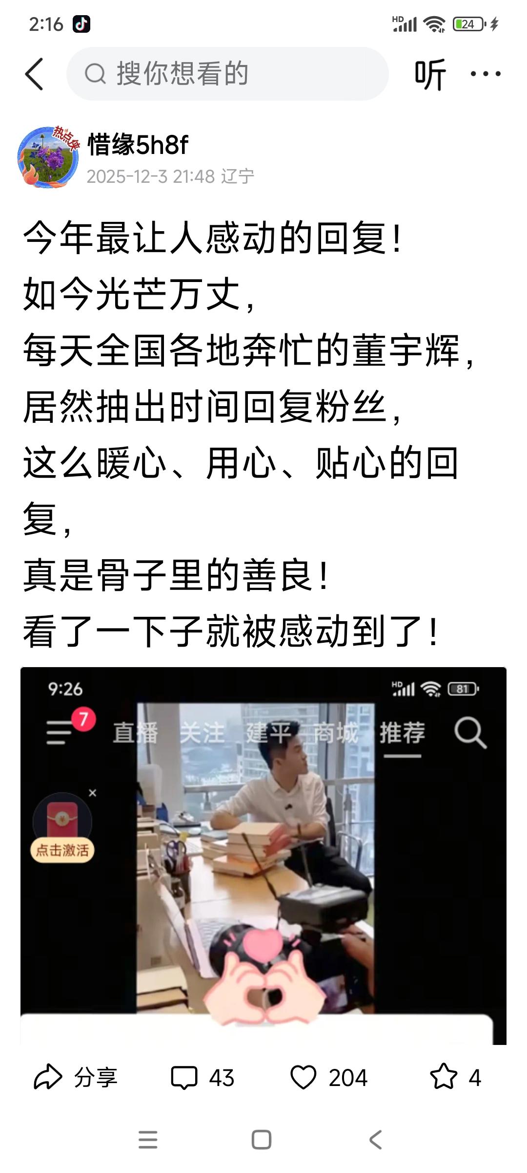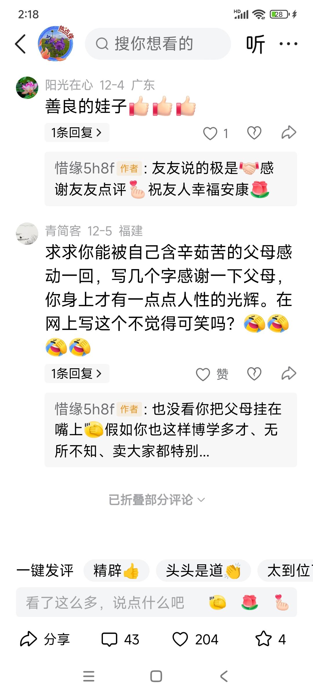 求求你能被自己含辛茹苦的父母感动一回,写几个字感谢一下父母,你身上才有一点点人性的光辉。在网上写这个不觉得可笑吗?[捂脸][捂脸][捂脸][捂脸] 因为感动,昨天复制了董宇辉给苦楚的粉丝的回复,还有我的几句感慨,咋还招来黑粉了。[黑线]看到上面的这样的评论,我都懵了![笑哭]尊崇董宇辉成了没人性的人了![灵光一闪]咋回事,这人是有病还是嫉妒了?[酷拽]