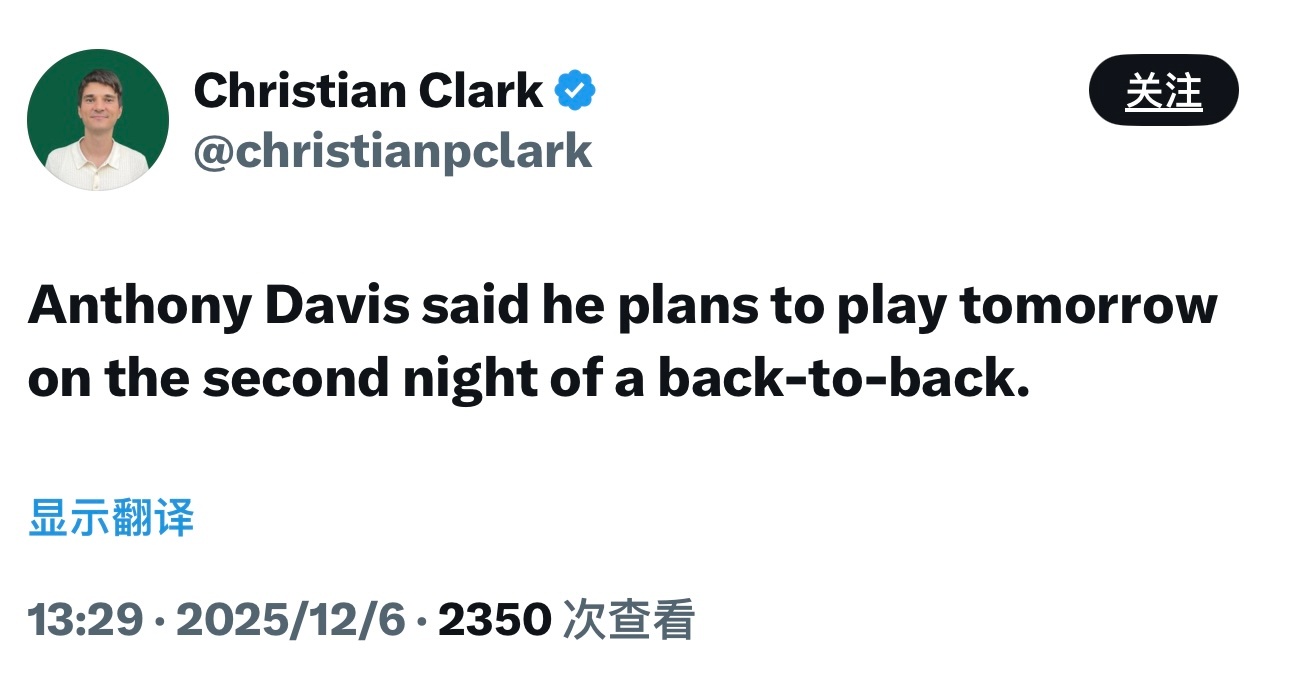 今天只得到2分的浓眉,计划明天背靠背出战排名在湖人之上的火箭,能不能……