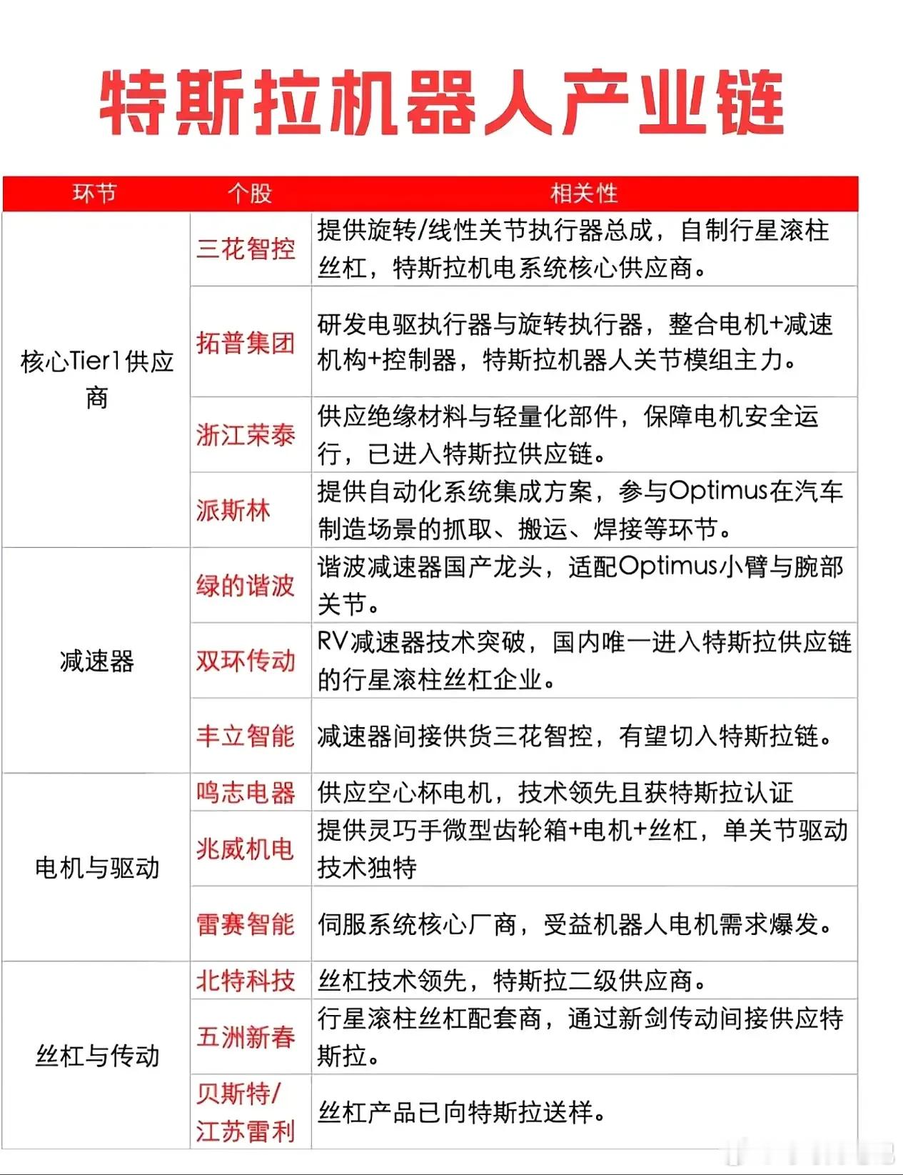 周末一个消息,大家务必关注。就是特斯拉即将量产,它的擎天柱机器人。特斯拉量产机器人之前,已经在我们这边开始挑选合格的供应商。就是他生产这么多的机器人,必须由我们来提供零部件,要不然它生产不出来。这就是,我们世界工厂的NB之处。不管世界科技巨头如何发展,所需要的零部件统统由我们提供。就像英伟达由我们提供光模块是一个道理。那么,这次特斯拉首批的合格供应商必将引起市场的强烈反应。下周重点关注,就是谁能成为首家特斯拉擎天柱机器人的合格供应商?那么,一旦成为他的合格供应商,业务出现新的增量,股价必然起飞。这可是个万亿的大市场。尤其是特斯拉的加持,更会让股价起飞。下面是我整理的特斯拉合格供应商名单,大家可以研究一下,现在股价就应该有所反应了。个人观点不构成投资建议。谢谢点赞,关注和评论a股今日看盘A股