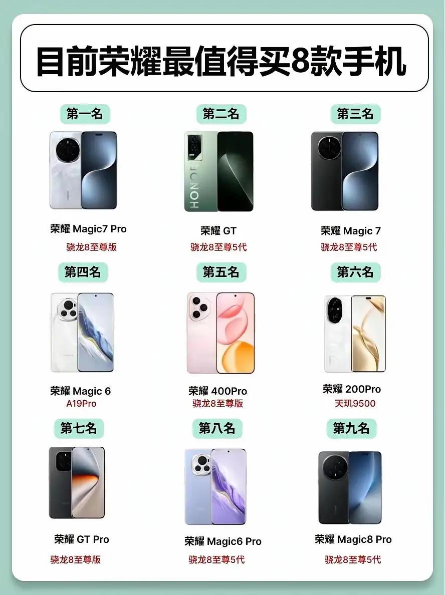 荣耀封神!2025最值得冲的8款手机,Magic7 Pro香到跺脚! 荣耀这波性价比直接拉满,8款神机款款戳中痛点!🔥 首推Magic7 Pro!16+512G国补后才四千多,骁龙8至尊版芯片+2亿潜望长焦+3D人脸,旗舰配置平民价,闭眼入不亏! 还有荣耀GT、Magic7、Magic6紧随其后,性能、影像、续航全在线,诚意直接拉满! 预算从千元到旗舰全覆盖,每款都没有明显短板,这波不冲真的会后悔! 你最pick荣耀哪款机型?