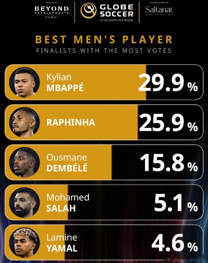 2025环足奖官方公布最新得票情况,最佳男足球员中,姆巴佩29.9%的得票率领跑。
