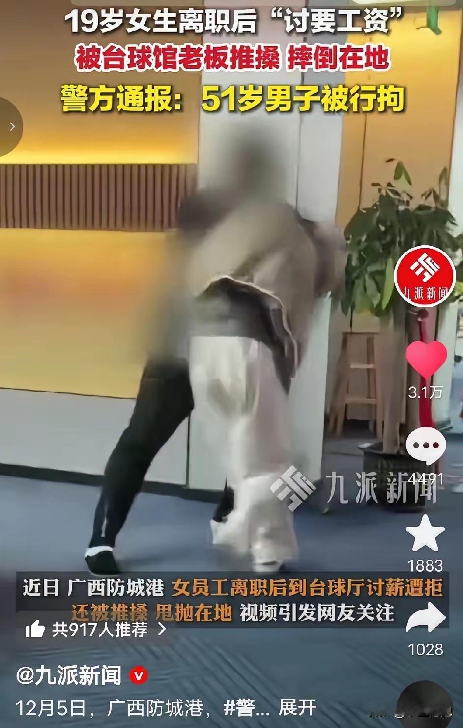 19岁女生讨薪被51岁老板“揪衣领甩摔”!台球厅满地球杆散落,警方刑拘,6人上万血汗钱该拿吗? 广西防城港有家台球厅,19岁的小杜和另外5个女生被辞退后,老板欠了她们一万多工资不给。小杜上门要钱,被老板揪着衣领甩在地上,监控都拍下来了,老板还在群里骂她们,说“打她们跟扔垃圾似的”。 这一万多是6个人做助教、前台赚的血汗钱,她们每天站到深夜,摆球摆得腰酸。有的是刚毕业的学生,有的想帮家里减轻负担,结果老板不光不给钱,还动手打人,就是觉得年轻人好欺负。 之前有个外卖小哥,为了200块超时罚款,在商家门口站了三小时,被老板泼水赶出来,他说这钱是自己跑十单赚的。和小杜一样,不是缺这点钱,是咽不下劳动被当笑话的气。 有人说老板有难处,但监控里他甩人的狠劲,和被警察带走后的怂样完全不一样,之前说没钱,警察一介入,转钱特别快。这不是难处,是觉得动手能吓退人。 老板在群里说“打她们像扔垃圾”,比动手更伤人。6个女生做台球助教,帮客人摆球、教打球,凭劳动赚钱,却被说“不正经”。不能因为是年轻女孩做服务工作,就活该被欠薪、被打。 现在老板被拘留,工资也给了,但小杜说工资给了,打人的事不能算完。这是给打工人争口气:能吃苦加班,但不能被随便拿捏。 还有个保洁阿姨,擦了三个月玻璃,老板不给工资还说“这点活儿不值钱”,阿姨把擦窗工具摆公司门口,最后在劳动监察帮助下拿回了钱。讨薪不是闹事,是维护自己的权利。 一万多对老板是几顿酒钱,对6个女生是房租、弟弟的文具钱、妈妈的降压药钱。她们的辛苦不该被当成“活该”,老板打人只换几天拘留,这事儿得说道说道。 各位读者你们怎么看?欢迎在评论区讨论。 来源: 九派新闻 声明:本文内容均是根据媒体披露资料,结合个人观点撰写的原创内容,文末已标注文献来源及截图,请知悉。 非法讨薪 台球厅被打 女员工讨薪