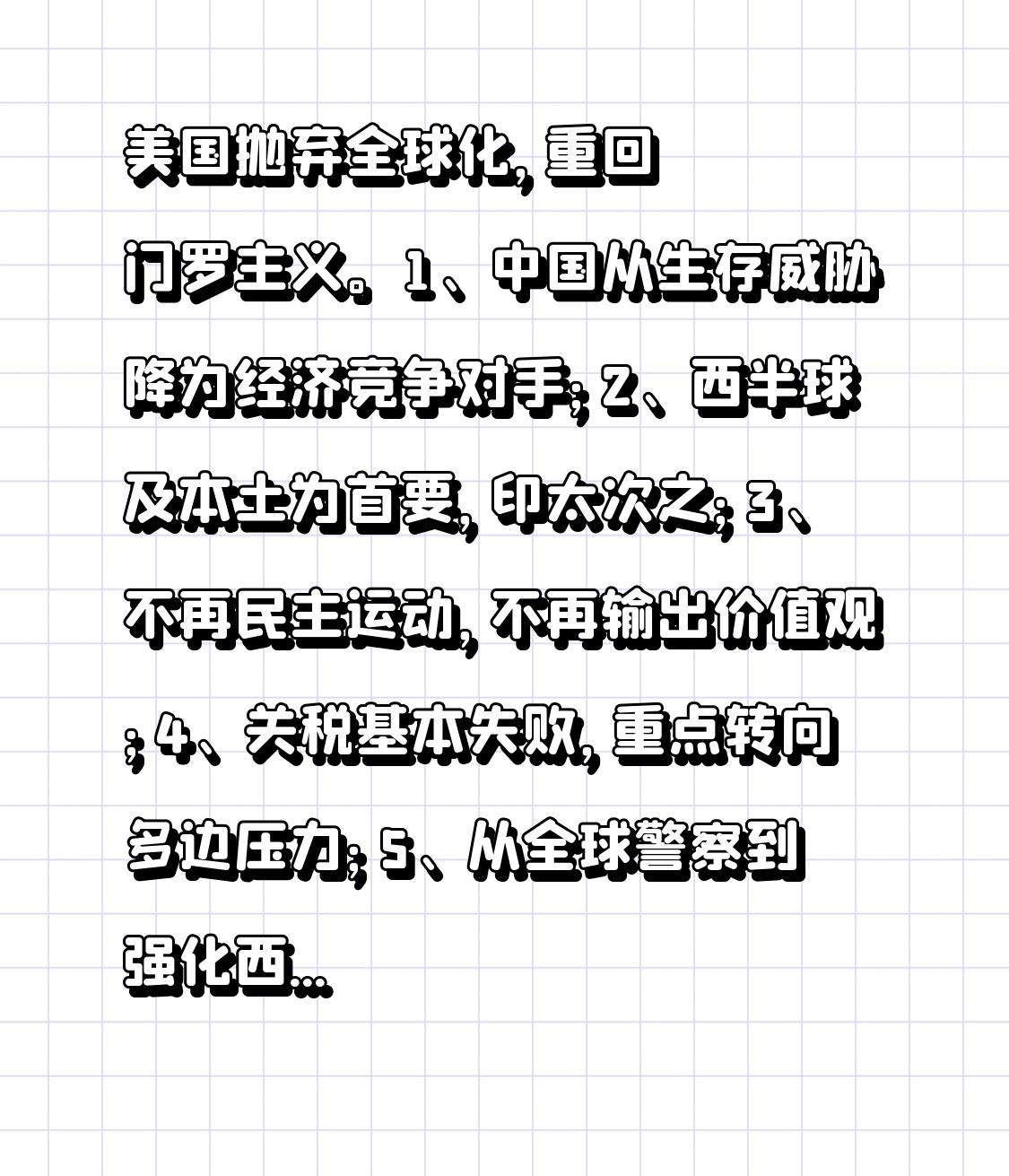 美国抛弃全球化,重回门罗主义。 1、中国从生存威胁降为经济竞争对手; 2、西半球及本土为首要,印太次之; 3、不再民主运动,不再输出价值观; 4、关税基本失败,重点转向多边压力; 5、从全球警察到强化西半球权力。