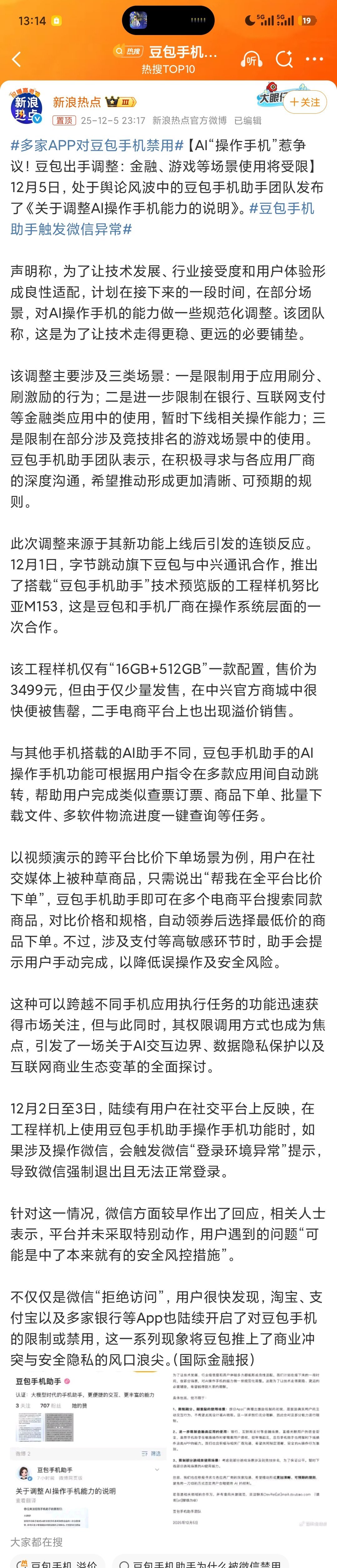 #多家APP对豆包手机禁用#豆包手机出的AI操作手机,一石激起千层浪,让整个手机和移动互联网行业为之一震。先是微信“拒绝访问”,很快淘宝、支付宝以及多家银行等App也对豆包手机限制或禁用。我觉得这种这件事的核心逻辑在于说,直接获取系统深层控制权限的厂商,是豆包合适,还是手机厂商自己做合适。其实类似的AI功能,我看到很多,像荣耀、小米自带的AI功能系统都可以实现。如果是手机厂商自己做,那么无论是用户,还是APP一方,可能都更容易接受。如果是像豆包来做的话,他作为一个和阿里的千万腾讯的元宝等存在一定竞争关系的企业,那么势必会引起其他竞争对手的担忧。归根结底,用户其实还好,核心还是一些存在竞争关系的品牌。但很多事儿并不是绝对的,比如在早期移动互联网刚兴起的时候,用移动手机发消息这个功能,本来飞信做的也挺好的,大家也默认他是最适合的,但最后也还是微信做起来了。 #豆包##豆包手机助手触发微信异常#