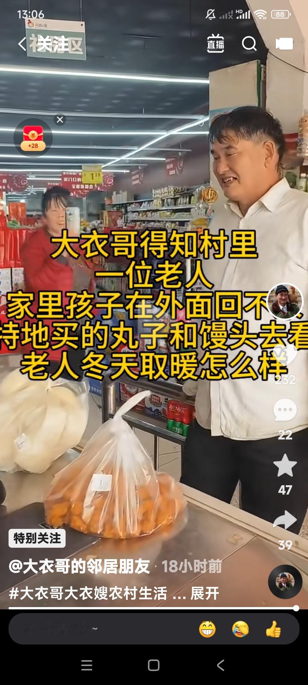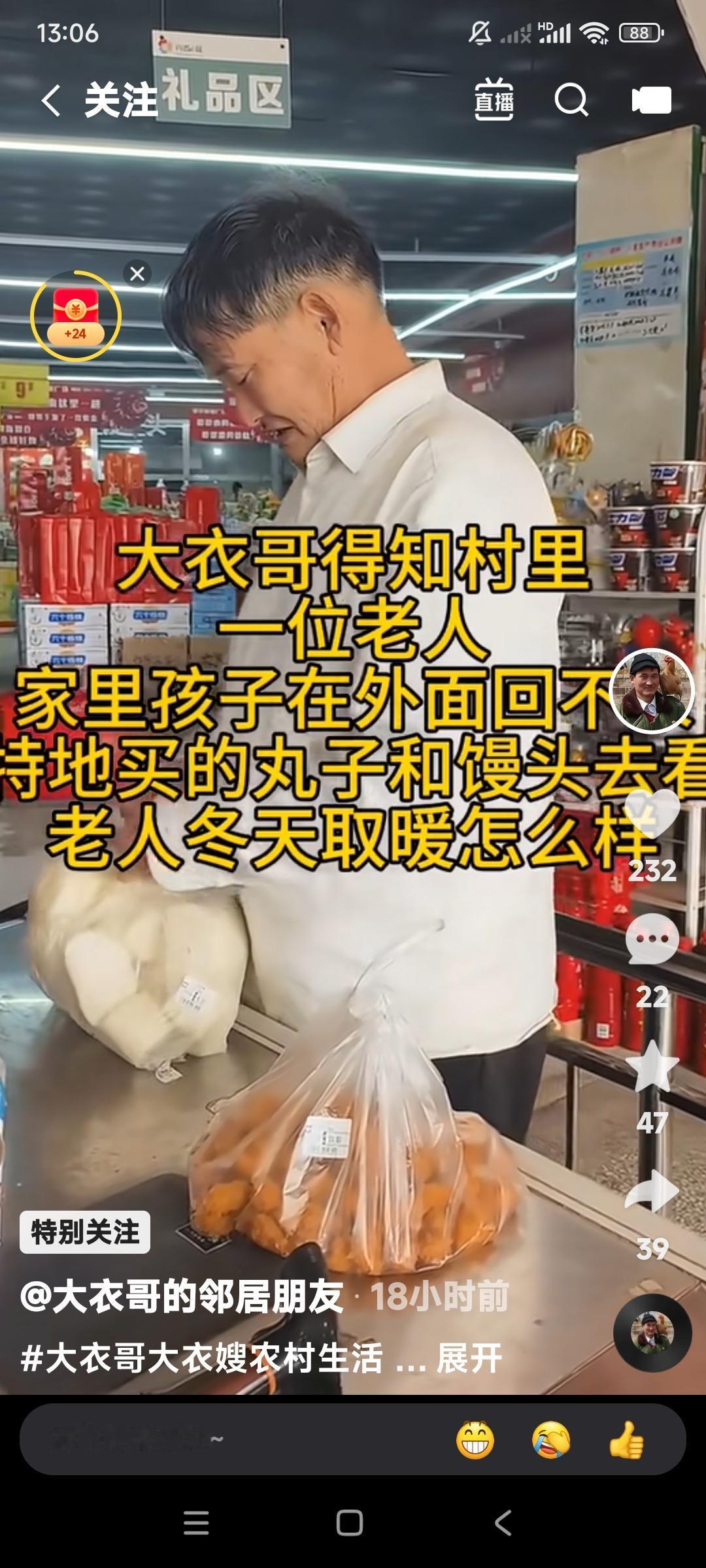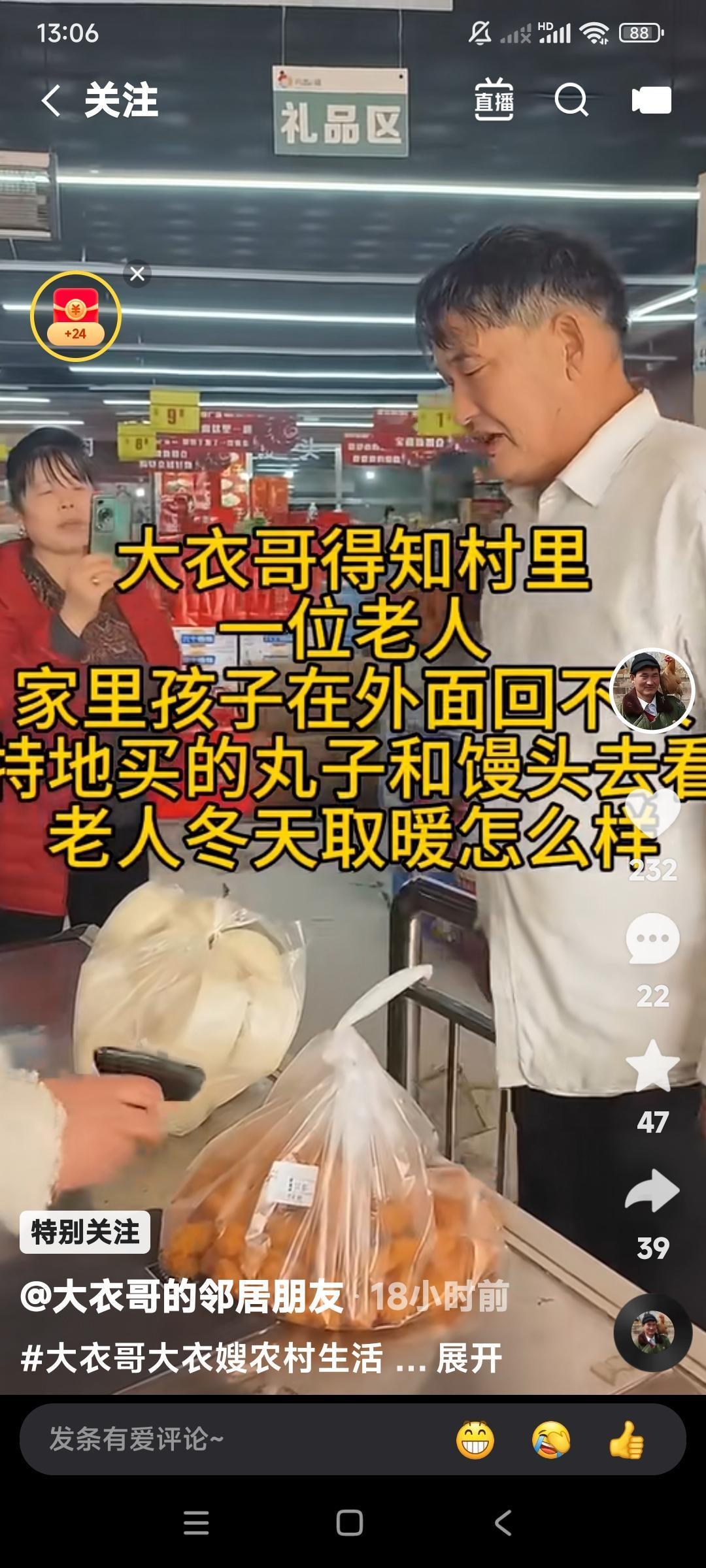大衣哥,朱之文又做了一次积福积德的好事儿了。 买了馒头和丸子,到留守老人家庭去慰问。 许多人都能对朱之文的这件事情表示赞扬。 恐怕又有一些人,一定会说朱之文在作秀。 可能是我以小人之心度君之腹了吧。 真心希望不要以此视频来对朱之文说三道四。 世上还是好人多。