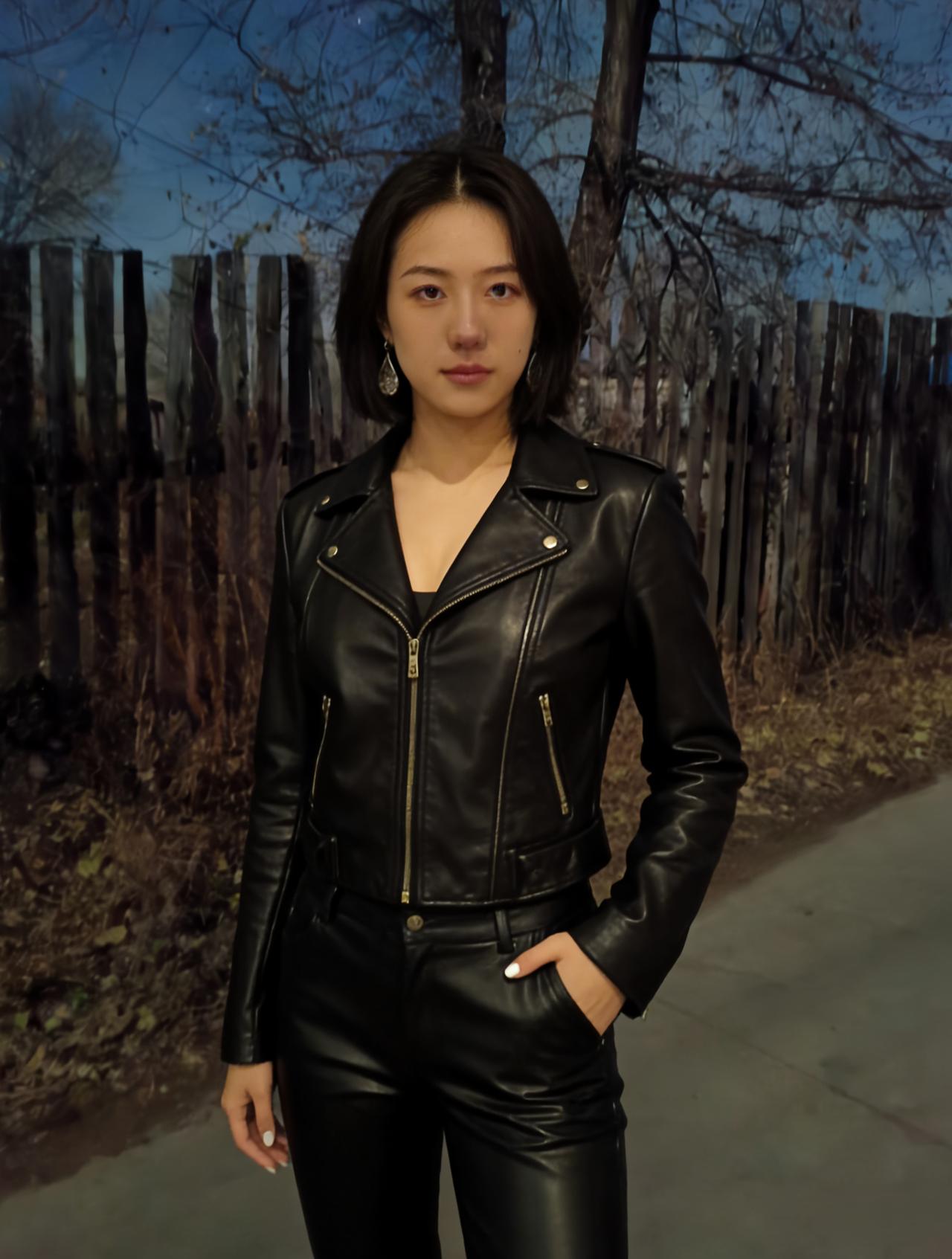 风把木栅栏的影子揉碎在身后 皮革的褶皱里藏着未熄的野火 她站着,像一截拒绝弯折的黑铁 睫毛上落着虚构的雪,不融化 ~ 指尖漫不经心插进口袋的弧度 是对周遭荒芜最轻的挑衅 枯树的枝桠伸向深蓝的天幕 而她的目光,比夜色更直,更冷 ~ 不必开口,金属拉链的咬合声 就替她讲完了所有关于独行的故事 那些被风磨尖的勇气,都缝在 翻领的针脚里,和呼吸共振 ~ 当旷野试图用寂静困住脚步 她的轮廓,是唯一不肯低头的路标