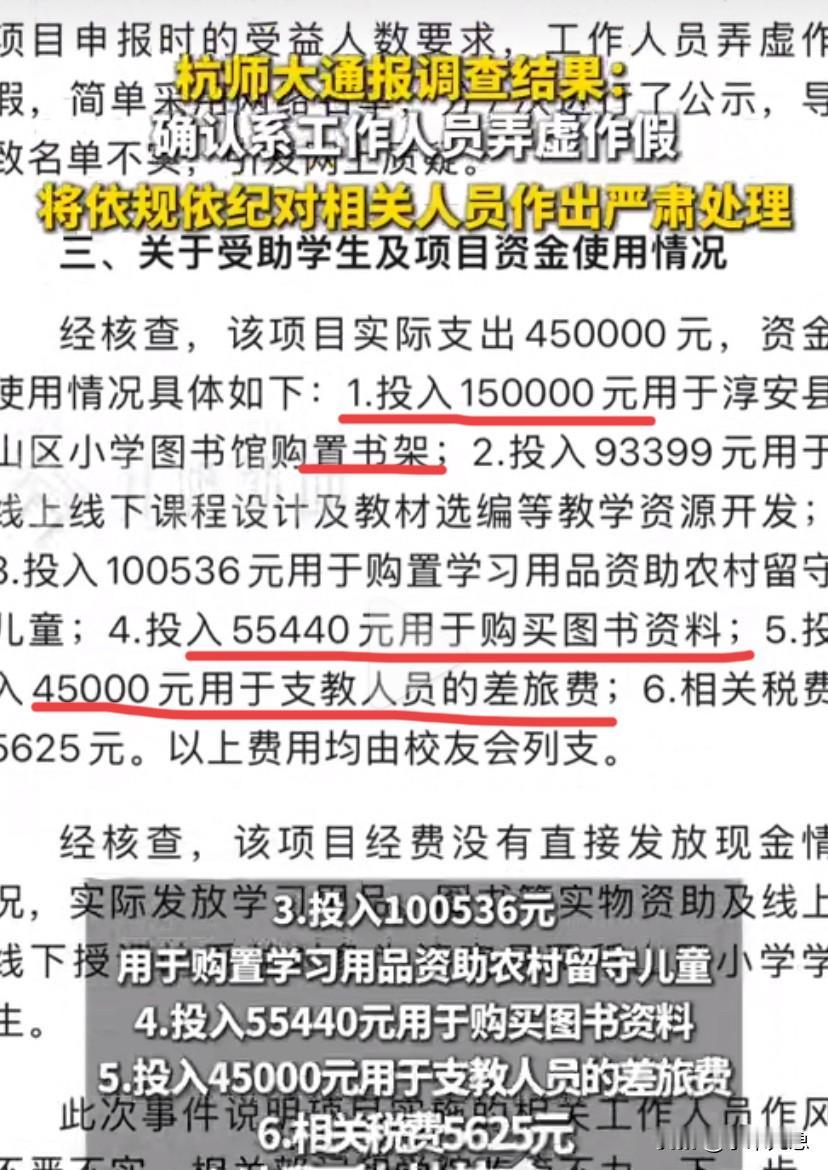 调查结果出来了,杭师大承认福彩公益项目的受益名单,是工作人员弄虚作假。 媒体报道,整个公益项目总经费一共45万,其中:买书架花了15万,教学资源开发花了9.3万,买学习用品花了10万,买书花了5.5万,差旅费花了4.5万,交税交了5625元。 这个账单一出,立马又引起网友们的质疑。买书架花的钱是买书的三倍。淘宝一个长1米的图书馆书架也就500元左右,花15万是买了300米长的书架吗?另外从杭州到淳安光差旅费花了4万5,这是去了多少人啊,要那么贵? 不知道这十五万的书架是谁中标了。被资助的学校名称又是什么?面对质疑,建议学校把时间,地点,人物,金额,供应商通通公布出来,这钱来自公益项目,不能模模糊糊。
