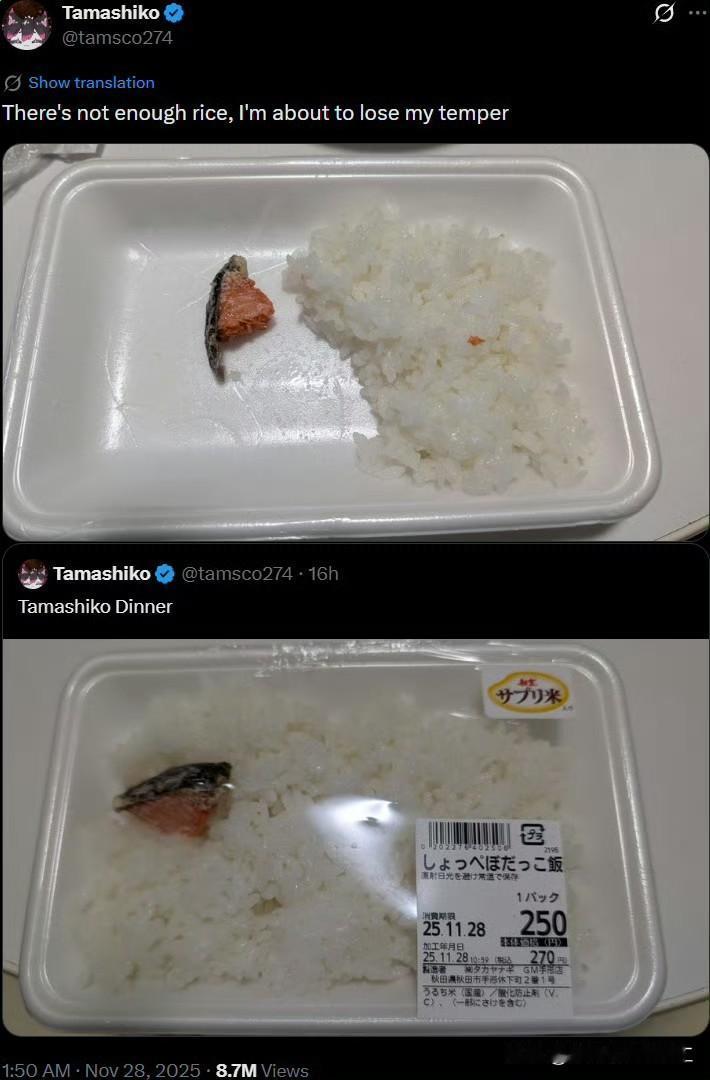 日本同一种米饭涨价还蛮厉害的 按照时间顺序排列 2025年11月22日卖270日元含税 2024年9月5日买150日元