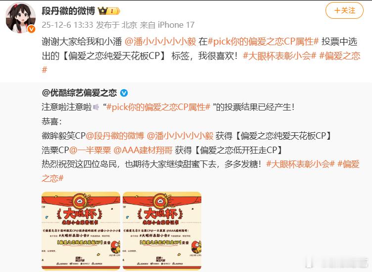 偏爱之恋纯爱天花板CP偏爱之恋低开狂走CP《偏爱之恋》【pick你的偏爱之恋CP属性】 的投票结果出炉!恭喜大家,希望多多发糖!大眼杯表彰小会 【偏爱之恋纯爱天花板CP】 徽眸毅笑CP【偏爱之恋低开狂走CP】浩粟CP