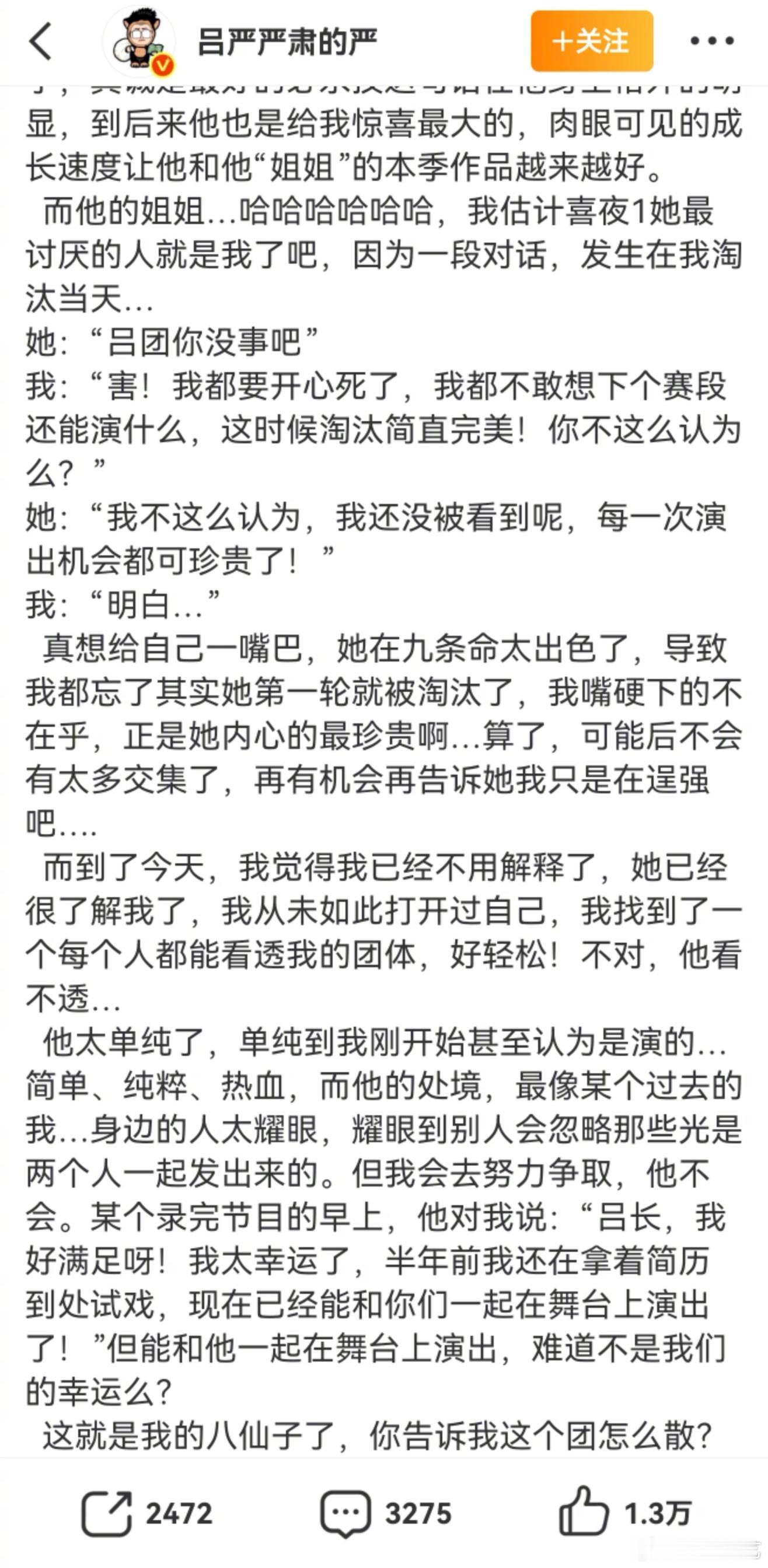 吕严发长文喜人奇妙夜 啊啊啊看完吕严为八仙子写的小作文破防了!虽然总是被说成第一吐槽役,但是八仙子的点点滴滴他都记得,甚至能娓娓道来!太好了八仙子太好了,每一位都太好了!八仙子!扒蚬子!