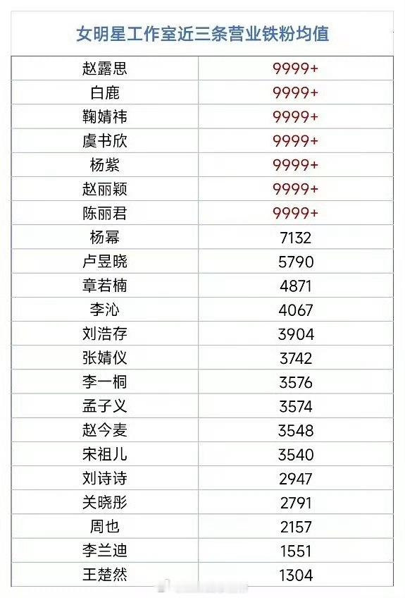 女明星工作室近三条营业铁粉破9999+的,有7位