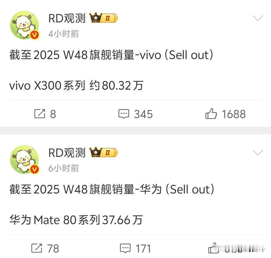 这么一对比mate80系列销量确实可以,接近vivoX300系列一半的销量了,首销三天表现可以,接下来就是要稳住,看看一周能不能提升个30万台销量的样子,毕竟过了首销后面的销量涨起来会慢一点[思考]其他国产旗舰机也是可以的,就看有没有补贴了