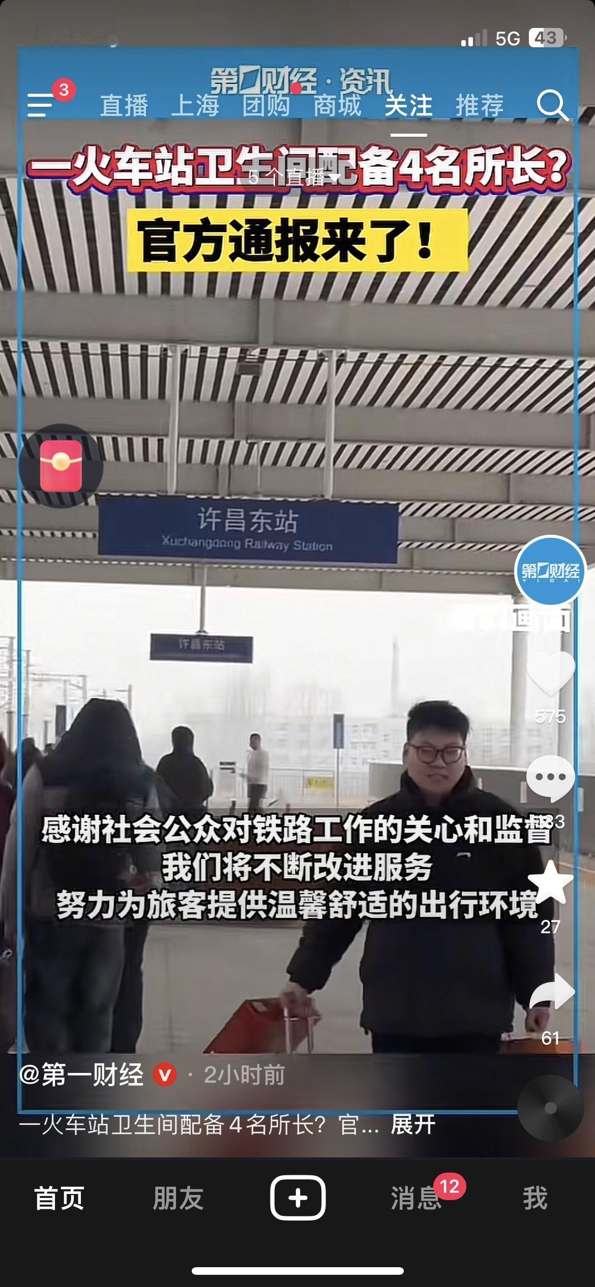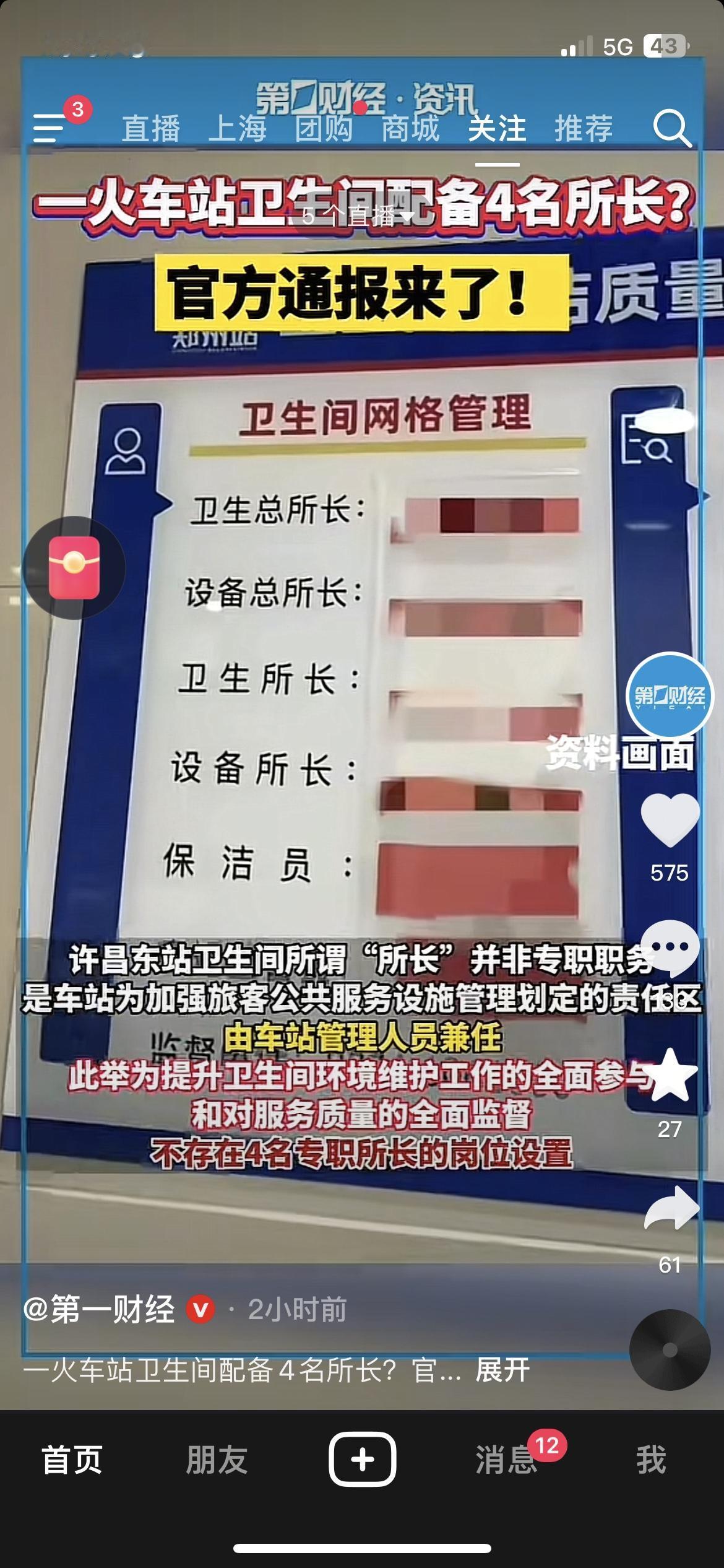 😂火车站卫生间配4名所长?网友吐槽后,官方回应真相 民生热点 公共服务管理 许昌东站卫生间贴出的网格管理表火了,表里标注了“卫生总所长”“设备所长”等4个“所长”岗位,不少网友看到后吐槽“一个卫生间要这么多负责人,官太多了”。 很快车站官方就回应了,解释这些“所长”都不是专职岗位,是车站不同部门的管理人员兼职的,相当于划分了责任区,每个人对应卫生、设备、服务等不同管理事项,就是为了把卫生间管理落到实处,避免出现问题没人管的情况。 你觉得这种兼职责任岗的管理方式合理吗?有没有必要搞这么多岗位名称?