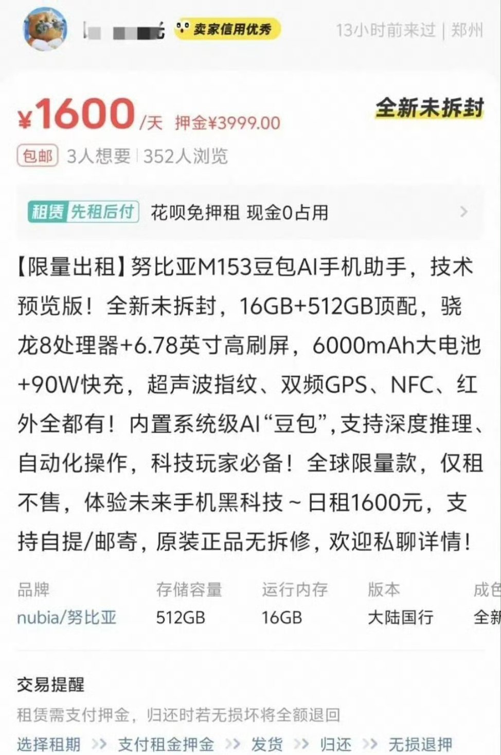 #豆包手机1600元租一天##豆包手机会颠覆手机行业吗#售价3499元的豆包手机(nubia M153 豆包手机助手技术预览版),在二手交易平台,有的售价居然高达1.29万元。即便是租用这款豆包手机,一天的租金高达1600元。于是科技圈开始讨论,豆包手机会颠覆整个手机行业吗?这个事儿我觉得可以分两方面来看:首先,类似的功能其实已经实现了,无需打开App即可完成跨平台操作。比如荣耀手机赵明就曾经在发布会上,通过语音操作手机点外卖。也就是说,长期来看,这个功能并不具备独家性,但豆包手机应该是AI功能,做的最彻底的一款。而且豆包是一个第三方平台,具有更大的想象空间,而之前都是手机厂商在系统层面做的,他们的创新比较慢也比较克制,而豆包,并不是手机厂商,联合努比亚一步到位,推出一款真正的AI手机,这可能就是外来的和尚会念经吧!其次,纵观整个智能手机发展史,从2007年乔布斯发布首款iPhone,手机的好像没有什么颠覆创新了。无非就是屏幕大一点,手机薄一点,摄像头模组换个样子,从各个方向的折叠屏……而AI手机则从软件层面切入,完全颠覆了之前的手机使用模式。这就好比医学领域,大家都在研究传统医学理论治病救人,突然有人从婴儿基因改造入手,让很多婴儿一辈子不会有很多病。这就是颠覆式的改变,但颠覆式的改变往往会对现有的格局产生冲击,比如传统的手机厂商,可能并不想出让自己底层的系统权限,和豆包有相对竞争关系,比如腾讯、阿里等巨头公司,估计也不想用户都是通过豆包来操作自家APP。这种竞争博弈如何调和,我觉得还是要看哪方技术断代式的领先,最终赢得用户,赢得竞争对手的认可。