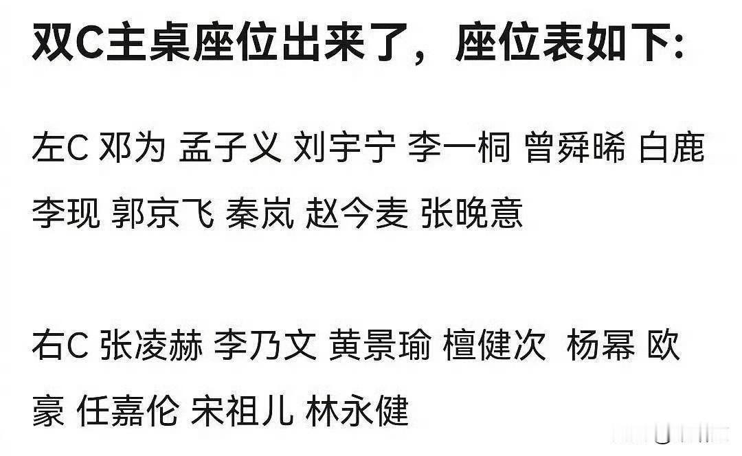尖叫之夜双C主桌太会排!杨幂白鹿没抢C位,私下互动甜到齁 尖叫之夜内场座位表一曝光,直接给我看呆了!双C主桌这阵容简直是内娱顶配,左C右C坐的全是熟面孔,本来以为杨幂和白鹿同框得有暗戳戳的较量,结果剧情完全反转。 左C这一排从头数,邓为银发造型跟漫画里走出来似的,挨着孟子义的古董婚纱,俩颜值放一块儿直接闪瞎眼。刘宇宁穿黑大衣戴皮手套,往那儿一坐跟大佬似的,和李一桐同框还真有大哥大嫂那味儿。 曾舜晞、白鹿、李现仨人凑一块儿热聊,白鹿那银白流光裙在灯光下贼亮眼,生图质感绝了。郭京飞、秦岚挨着赵今麦和张晚意,老戏骨带新生代,这搭配看着就舒服,唠嗑的劲儿都透着亲切。 右C这边更热闹,张凌赫鎏金西装帅得像小说总裁,黄景瑜往那儿一坐气场全开,檀健次修身礼服衬得身形挺拔,光看这排面就知道不一般。林永健老师混在年轻艺人里,画风挺有意思。 最让人没想到的是杨幂和白鹿,俩双C没抢镜没端着,台下偷偷热聊不说,还跟着一起玩扔水瓶,杨幂精准投掷那下,给白鹿逗得笑开花,完全没有网传的竞争感。 任嘉伦黄色寸头太亮眼,和欧豪、宋祖儿凑一块儿唠得火热,李乃文在旁边插科打诨,这桌的氛围比春晚还热闹,镜头扫到的时候,每个人脸上都挂着真心的笑。 本来以为双C主桌得是暗流涌动,结果全是真性情互动。秦岚忙着跟旁边人唠嗑,郭京飞偶尔插句玩笑,张晚意那一身正气的样子,活脱脱体制内男友既视感,每个细节都戳人。 内娱盛典就该这样,没有勾心斗角只有互相欣赏。杨幂靠实绩稳坐主C,白鹿凭实力圈粉,前辈后辈各有亮点,不是零和博弈而是双向奔赴,这样的名场面才让人看得过瘾。 别总盯着C位争高低,能靠作品站稳脚跟,能和同行真诚相处,才是真本事。流量会过时,热度会褪去,但实力和人品永远不会骗人,这才是内娱该有的样子。 内娱的精彩从不是独美,而是强者互相成就,真心换真心才能走得远!