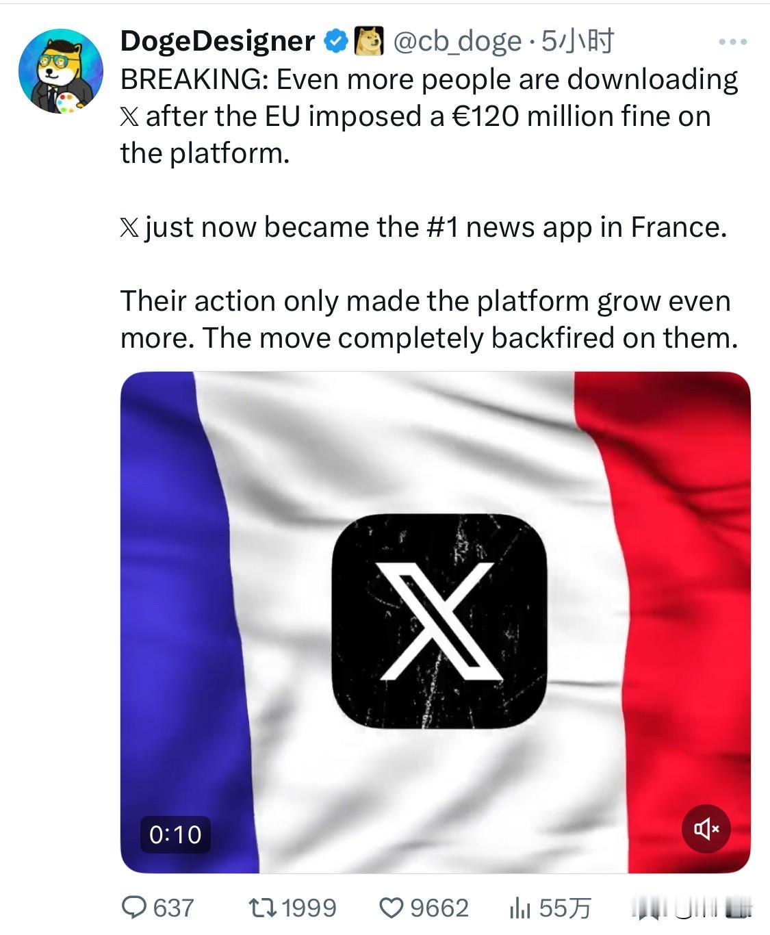 突发新闻:欧盟对马斯克的X平台处以 1.2 亿€罚款后,下载𝕏反而更高了。 𝕏刚刚成为法国排名第一的新闻应用程序。 他们的行为反而让这个平台发展得更快了。这一举动完全适得其反。 “欧盟监管机构意外发现,没有什么比推出1.2亿€ ‘限量版争议产品’更能提升下载量了。这真是X公司从未聘请过的最佳营销团队。”