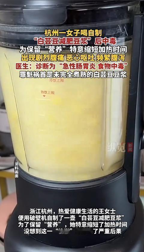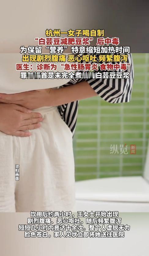 “悲剧还是发生了!”近日,浙江杭州,一女子为了减肥,在家自制一壶白芸豆豆浆,为了更好地保留营养,女子还特意少煮了一会儿,结果喝完2个小时,女子就开始上吐下泻,去医院检查,被诊断为食物中毒!网友:自作聪明。 女孩子都渴望拥有苗条的身材,对于体重那是相当的在乎,基本上每天都要量好几遍体重,生怕多吃一口饭就会变胖。而为了减肥,不少女孩更是尝试了各种办法,但有些办法并不适合所有人。 就说这白芸豆,这两年被吹成了“减肥神器”,网上到处是说它能阻断碳水吸收的帖子。杭州这姑娘估计也是刷到了类似内容,才想着自己动手做豆浆。她可能觉得,外面买的加工过,不如自己做的纯,营养保留得多,减肥效果也更好。可她忘了,豆类这东西,没煮熟透是会出大事的。 白芸豆里有种叫皂素的东西,还有些天然毒素,得经过充分加热才能破坏掉。这姑娘倒好,为了“保营养”,故意缩短煮的时间,豆浆估计还带着点生豆味就喝下去了。这不,俩小时不到,肠胃就开始抗议,上吐下泻折腾得人直不起腰,到医院一查,妥妥的食物中毒,又得输液又得调理,罪受了不说,减肥计划也彻底泡汤了。 身边这样的例子真不少。前阵子楼下小敏,为了瘦,天天只吃水煮菜,油盐都不敢放。没俩星期,人是瘦了点,可蹲地上系个鞋带,站起来眼前一黑差点摔倒。去医院一看,低血压加营养不良,医生骂她“拿命换瘦”。还有同事小李,跟风吃那种号称“排油”的减肥药,结果上厕所都控制不住,出门得垫着护垫,尴尬不说,最后肝功能还出了问题。 减肥这事儿,说白了就是图个好看、健康,可现在好多人都跑偏了。网上那些减肥偏方,今天说这个能瘦,明天吹那个特效,没几个人真去查证靠谱不靠谱。就像这白芸豆,就算真有阻断碳水的作用,前提也得是处理得当啊。拿自己的身体当试验田,赌赢了可能瘦几斤,赌输了就是进医院,这笔账怎么算都不划算。 再说了,胖点瘦点真没那么重要。健康的气色、挺拔的精神头,比那数字秤上的数好看多了。我姑以前总嫌自己胖,节食节食的,头发掉一把,月经也乱了。后来想通了,每天去公园跳广场舞,饮食均衡了,虽然体重没降多少,但整个人看着特精神,穿衣服也比以前好看。 说到底,减肥没有捷径。想吃得健康,就多学学正经的营养学知识,别信那些道听途说的“妙招”。想动起来,就找个自己能坚持的运动,跑跑步、跳跳操都行,别指望一口吃成瘦子,也别想着靠什么奇奇怪怪的法子走捷径。 这杭州姑娘也算吃了个教训,希望她好了以后能明白,比起瘦,身体好好的才是最实在的。毕竟,真要是把身体搞垮了,再苗条又有啥用呢? 各位读者你们怎么看?欢迎在评论区讨论。
