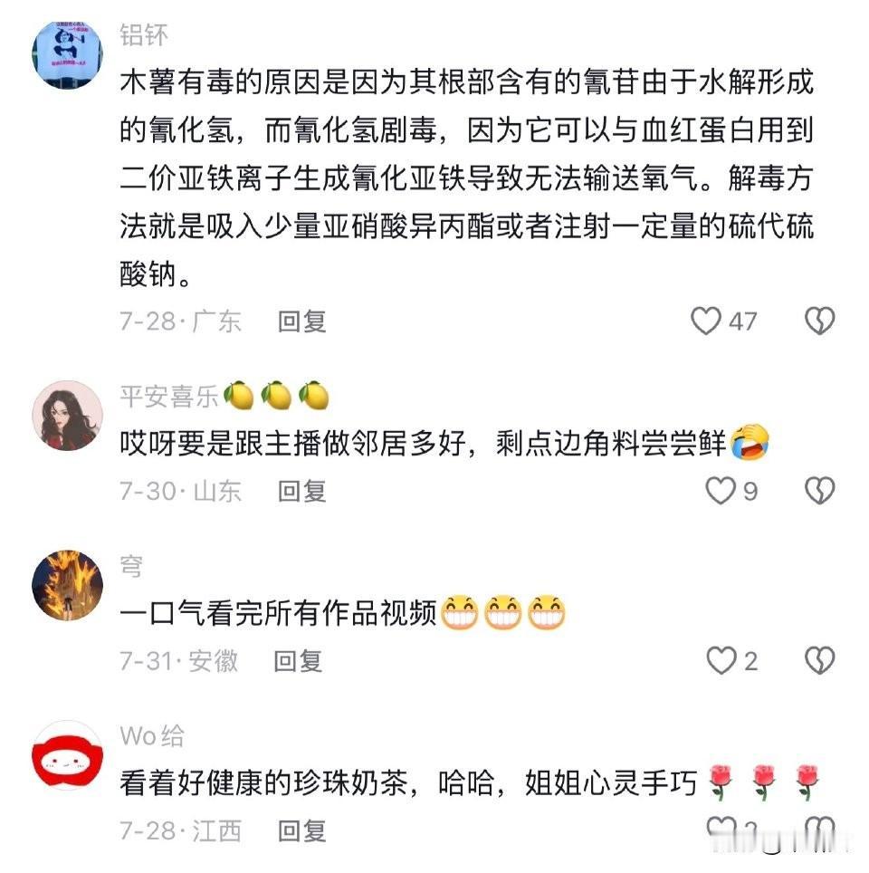 83岁憋老爷离世引木薯中毒疑云?真相打脸谣言,这些误区要人命 83岁网红憋老爷去世前4天喝了木薯糖水,网上直接炸了锅,不少人一口咬定是木薯中毒害死的,说得有鼻子有眼,差点就让谣言盖过真相。 可医学专家一出来辟谣,大家才知道瞎操心了!木薯急性中毒潜伏期就2-6小时,真要是中毒,当天就该有反应,哪能等4天?老人离世其实是器官衰竭、自然衰老导致的。 家属也拿出了制作记录,木薯不仅彻底去皮,还浸泡了3小时,最后煮了整整1小时,每一步都符合安全规范,根本不存在处理不当的问题,谣言不攻自破。 先说说大家最容易踩的坑:总有人觉得“甜木薯无毒”,这纯属误区!甜木薯只是毒素含量低,不是没有,要是不规范处理,照样可能中毒,之前就有网友把它当红薯生吃,结果进了医院。 还有人说“市售珍珠奶茶危险”,这也是瞎担心。奶茶里的珍珠用的是工业脱毒的木薯淀粉,生产过程中早把毒素处理干净了,正规渠道购买的,完全可以放心喝,不用杯弓蛇影。 木薯中毒的根源是氰苷,这东西怕热又易溶于水,所以处理时必须去皮(皮和芽眼毒素最多)、长时间浸泡、彻底煮熟煮透,这三步少一步都不行,别心存侥幸。 之前就有过真实案例:有人图省事,木薯泡了半小时就下锅,煮了20分钟就捞出来吃,结果一家人全中毒,上吐下泻还头晕,幸亏送医及时才没出事,这就是没把安全当回事。 其实最安全的办法就是优先买正规预加工木薯制品,比如木薯淀粉、现成的木薯块,人家已经做好脱毒处理,回家简单烹饪就行,既方便又放心,不用自己费劲处理。 老人离世本是让人难过的事,可有些人为了博眼球,凭空臆测、散布谣言,不仅误导大众,还让家属寒心,这种行为真的太不应该,做人得有底线,不能拿别人的悲痛当流量。 这事儿也给大家提了个醒,遇到类似新闻别盲目跟风传谣,多等一等官方消息、听一听专业意见,同时多学些食品安全知识,才能避免被谣言带偏,也能保护好自己和家人。 谣言止于智者,安全源于谨慎。不造谣、不信谣、不传谣,既尊重他人,也保护自己,这才是我们该有的处事态度!