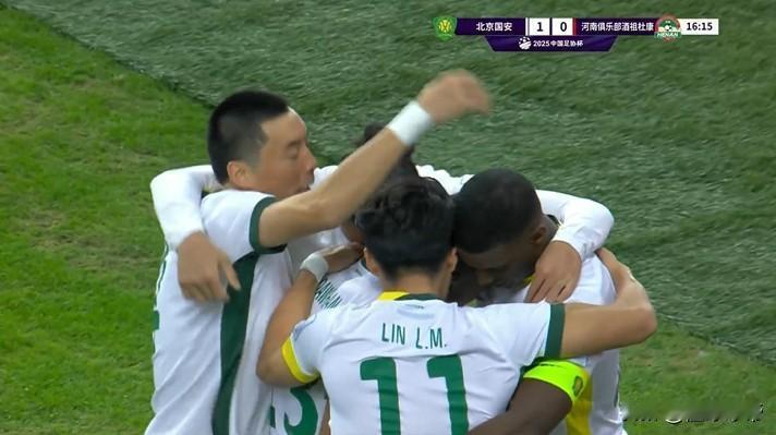 实力还是有差距,国安在比赛第16分钟破门1-0领先! 在今晚进行的2025足协杯决赛中,国安队在比赛第16分钟的时候做出了精彩的连续配合:恩加德乌在后场中路得球后分给吴少聪,吴少聪又把球分左路李磊,李磊把球带回来右脚回传给吴少聪,吴少聪调整一下左脚的横传给恩加德乌,恩加德乌分边到王刚脚下,王刚又把球横敲给达万,达万推传给古加,古加出球向前给张玉宁,张玉宁又回撤做球给达万,达万推进到了前场右侧传给了法比奥一路杀入禁区,法比奥在禁区内右侧低射一脚被王国明扑了一下,曹永竞跟进的插上让门前形成乱战,然后法比奥利用乱战补射得手,国安1-0取得完美开局。 不得不说国安这个进球配合的太好了,一路把球传进了禁区,流畅程度仿佛在看阿森纳的比赛一样,国安的实力还是强于河南不少,今晚河南想要赢球有点难了。