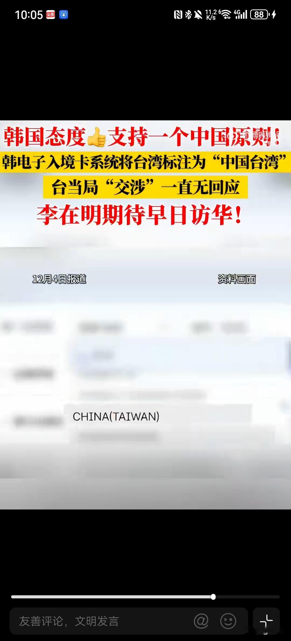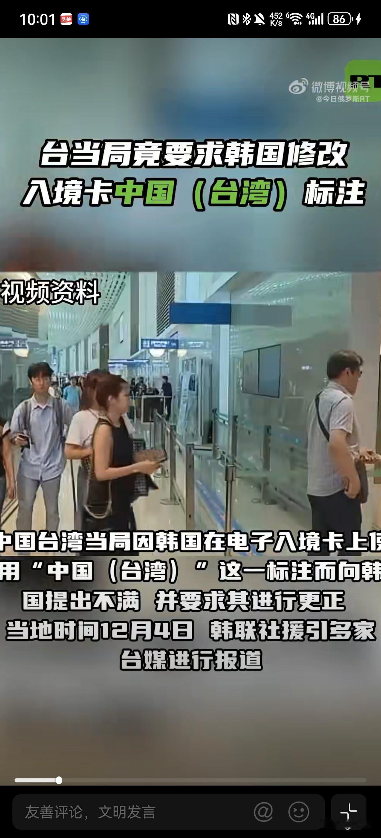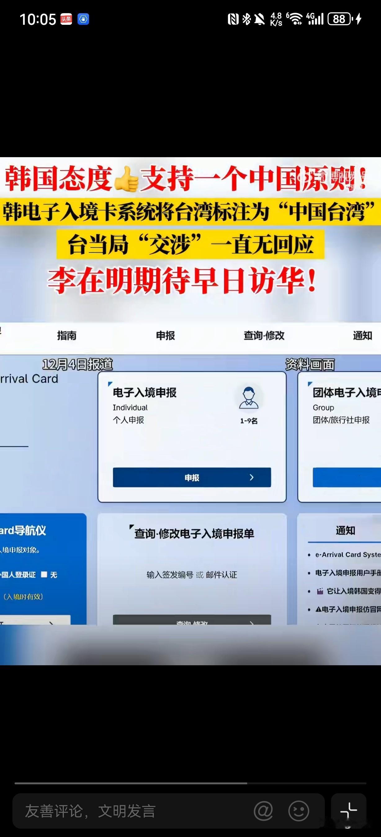 韩国官方电子入境卡申报系统完成关键更新,在“出发地”与“下一目的地”栏目中,台湾地区被明确标注为“中国(台湾)”,与香港、澳门一同归入“中国”分类下,台湾居民需勾选该规范选项才能完成入境申报,不按此操作则无法顺利入境。 韩国总统李在明对此立场鲜明,明确表态只有承认台湾是中国台湾,才能入境韩国,否则不予放行。韩方强调,此次系统更新并非临时决策,而是严格履行1992年《中韩建交联合公报》中的承诺。韩国对台湾地区的规范标注早有铺垫,此前韩亚航空已将台湾从“东南亚”栏目迁移至“中国大陆及港澳台”分类,此次入境系统更新进一步固化了这一立场。
