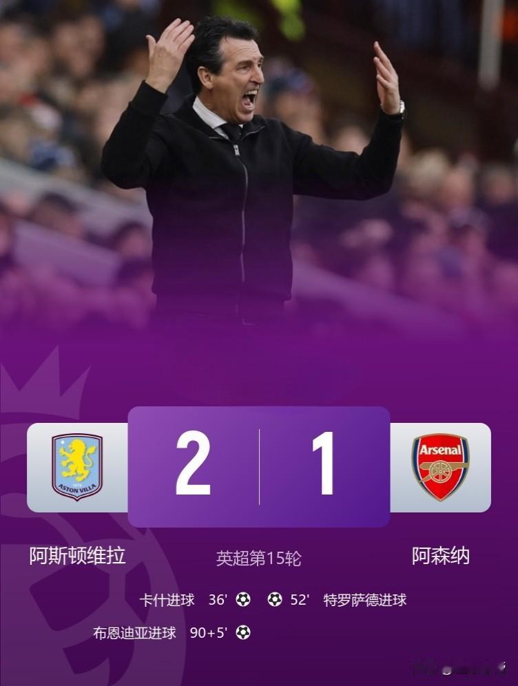 熟悉的掉链子的阿森纳又回来了,阿森纳1-2惨遭维拉爆冷绝杀! 在刚刚结束的一场英超焦点大战中,领头羊阿森纳对阵排名第三的阿斯顿维拉,上半场阿森纳0-1落后,下半场好不容易扳平比分,没想到维拉却在比赛补时第95分钟上演终极绝杀,最终阿森纳1-2爆冷输给了维拉,各项赛事18场不败惨遭终结。 阿森纳这一场输球,让英超冠军又充满了悬念,现在阿森纳多赛一场只领先维拉3分,如果今晚曼城赢球的话,那么阿森纳就只领先曼城2分了,后面一场比赛就能让阿森纳丢掉榜首了。 曾经那个掉链子的阿森纳又回来了,在掉链子这件事上阿森纳从来没有掉过链子,这赛季要是再拿不到英超冠军的话,那么阿森纳就真没有冠军命了,以后也再也拿不到了。