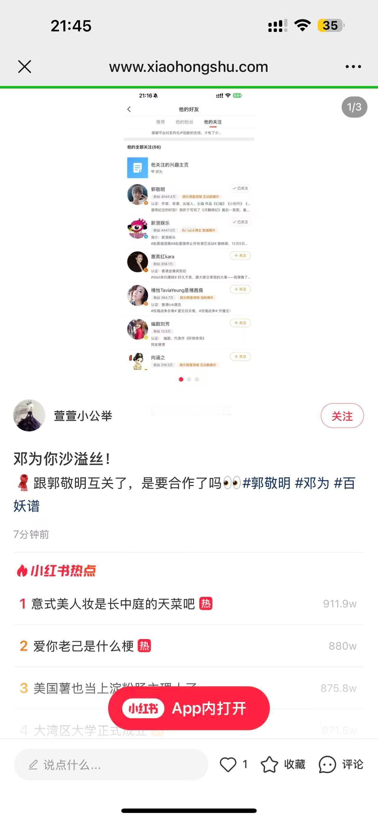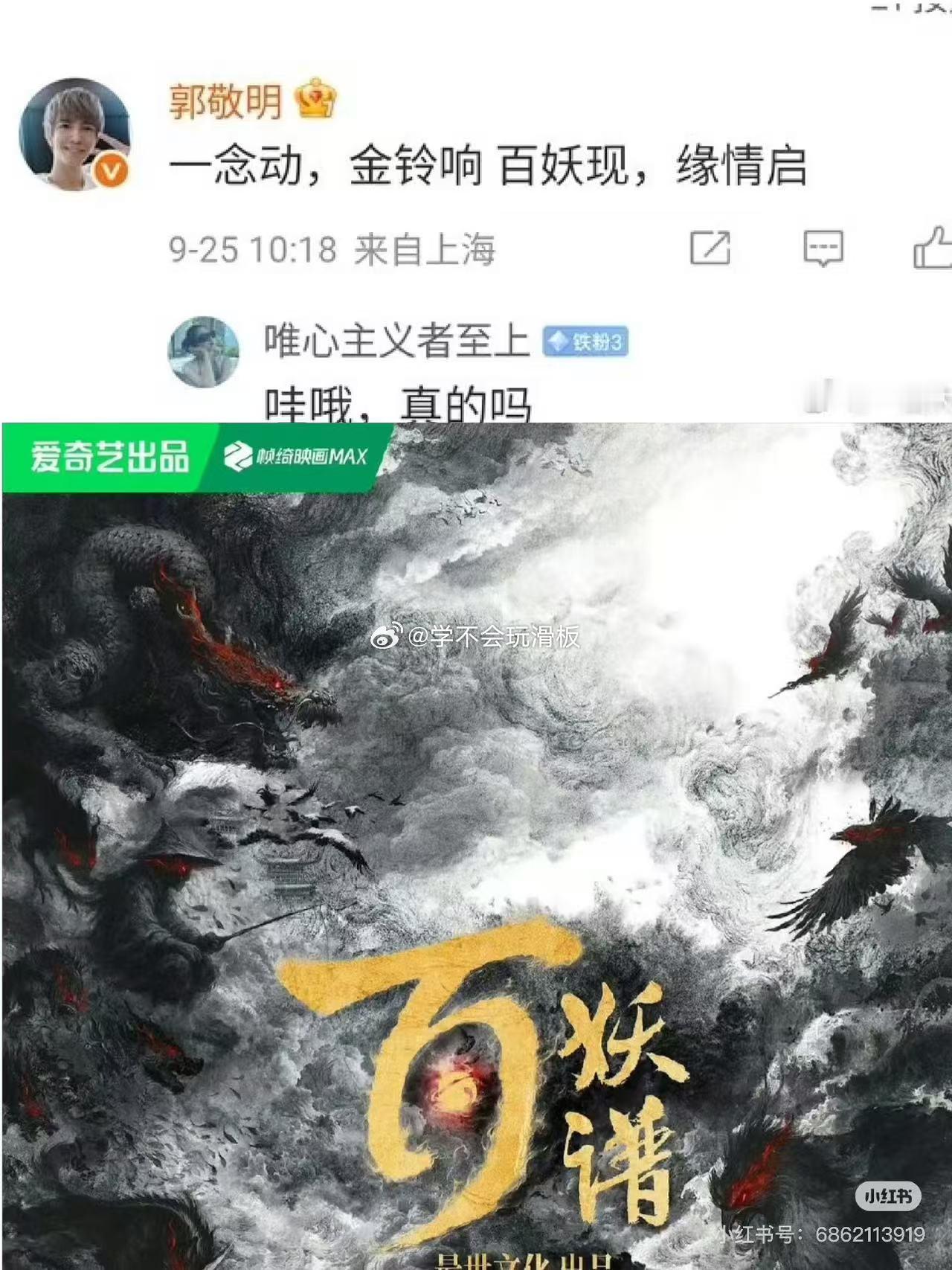 邓为郭敬明互关邓为关注郭敬明,疑似即将合作爱奇艺《百妖谱》。