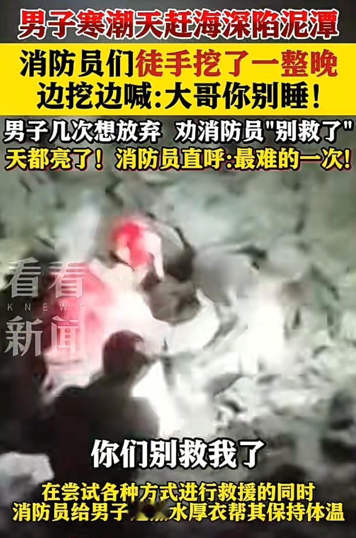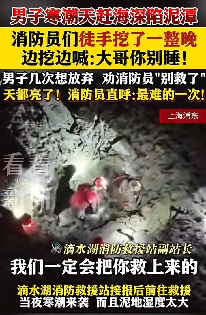 大哥说:你们别救我了,你们走吧!天气太冷了,我不想连累你们,可消防员说:大哥你别睡,我们一定会救你出去的。 上海浦东一名男子去赶海不慎陷入泥潭,瞬间淹没到膝盖处他预感到此次自己凶多吉少,并没有做太多挣扎,因为他感觉到双腿被一股力量深深的吸住无法动弹,此刻天已经伸手不见五指,方圆一公里除了海风已经听不到其它声音了,他颤抖着双手掏出手机,拨打了119救援电话,挂断电话后淤泥已经到大腿中部了,此刻他已经做好了最坏的打算。 消防员赶到的时候淤泥已经到达他的胸口处,丢给他一条救援绳他已经没有力气去握紧,无论怎样都拉不上来,消防员副队长说:下去拖人,一名消防员立刻回答:我去。 下去后凭一个人的力量怎么也拉不上来,消防员也慢慢的陷入泥潭,所幸的是到膝盖的地方就不在下陷,可大哥那里却陷的异常深,消防员说:只能用手一点点把淤泥挖开,只见他非常艰难的开始行动,一米多深啊用手挖,大哥此时已经有点眩晕,消防员不停的鼓励他:大哥别睡坚持一会,一边用热水厚衣服给大哥取暖,一边徒手挖淤泥,大哥看到消防员那无畏的举动,心疼的对他们说:别挖了你们走吧!天气太冷了。 消防员眼神坚定的对他说:大哥你要坚持住,我们一定会带你出去的,我们一定会带你出去的。 到了早上5.55分,经过一个晚上的努力,终于将男子救了上了,此时的消防员已经精疲力尽,7.10男子被送往医院检查无大碍,在当天晚上就平安回家了。 救援站副站长回忆:这次是救援时间最长,难度最大的一次,男子几次要求让我们放弃救援,可我想对他说,在任何情况下我们都不会放弃救援。
