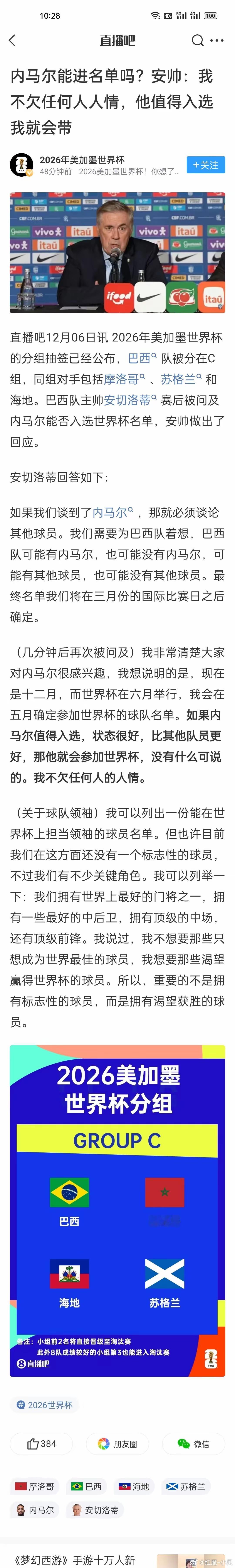 内马尔能进名单吗?安帅:我不欠任何人人情,他值得入选我就会带。为什么带,1998没带罗马里奥,2010没带小罗,2014没带卡卡。内马尔这三年来值得带?以前巴西的比赛内马尔和维尼修斯在左路毫无化学反应,维尼又是安胖子嫡系,如果入选了给不给主力?以内马尔在巴西的影响力,这样的球员不给主力更衣室和舆论必炸,这是安胖目前最大的难题。足球世界杯内马尔