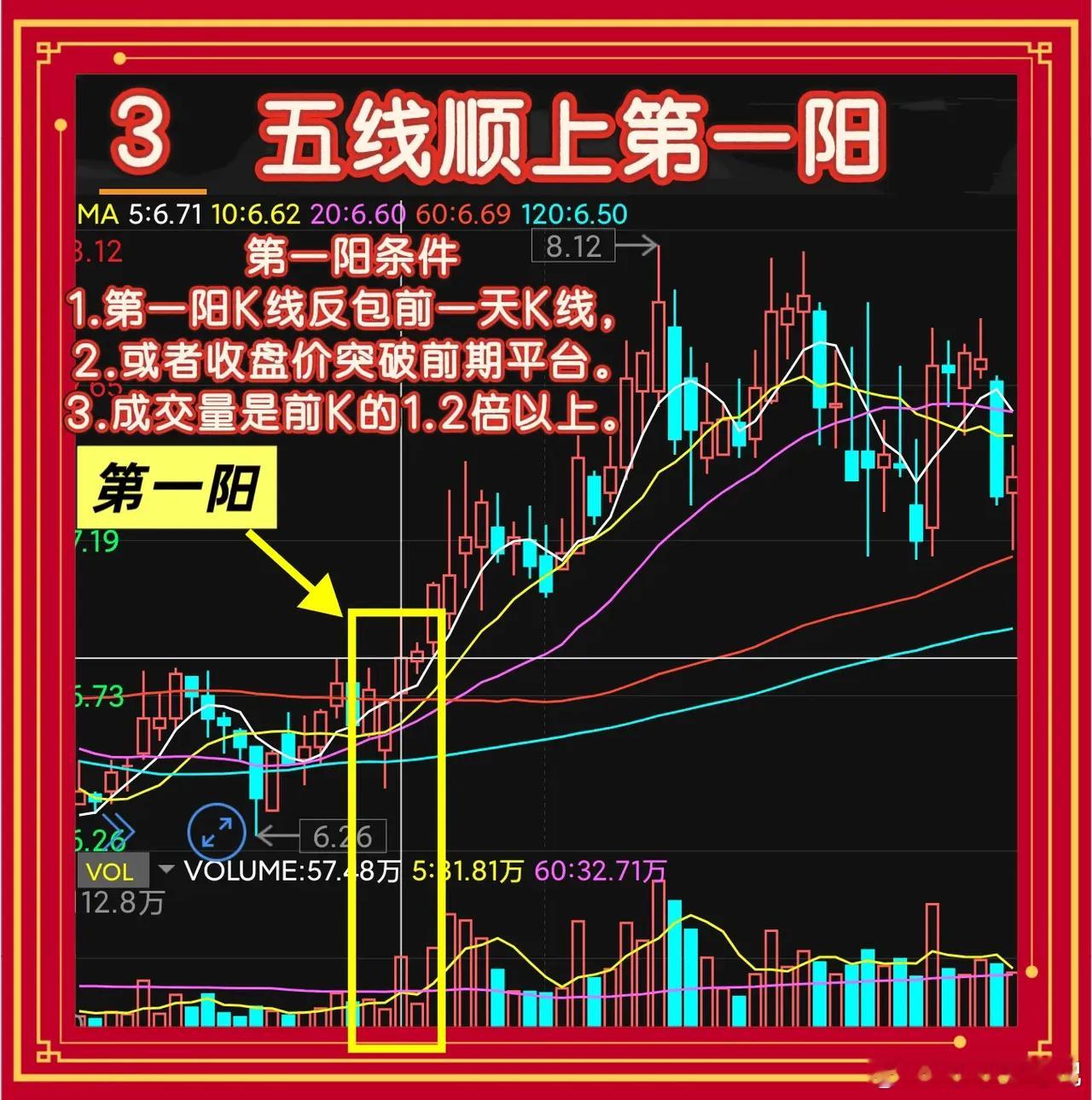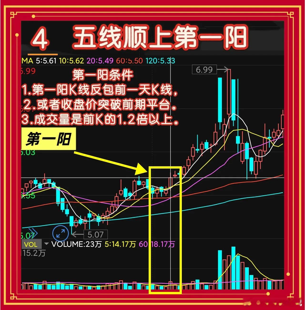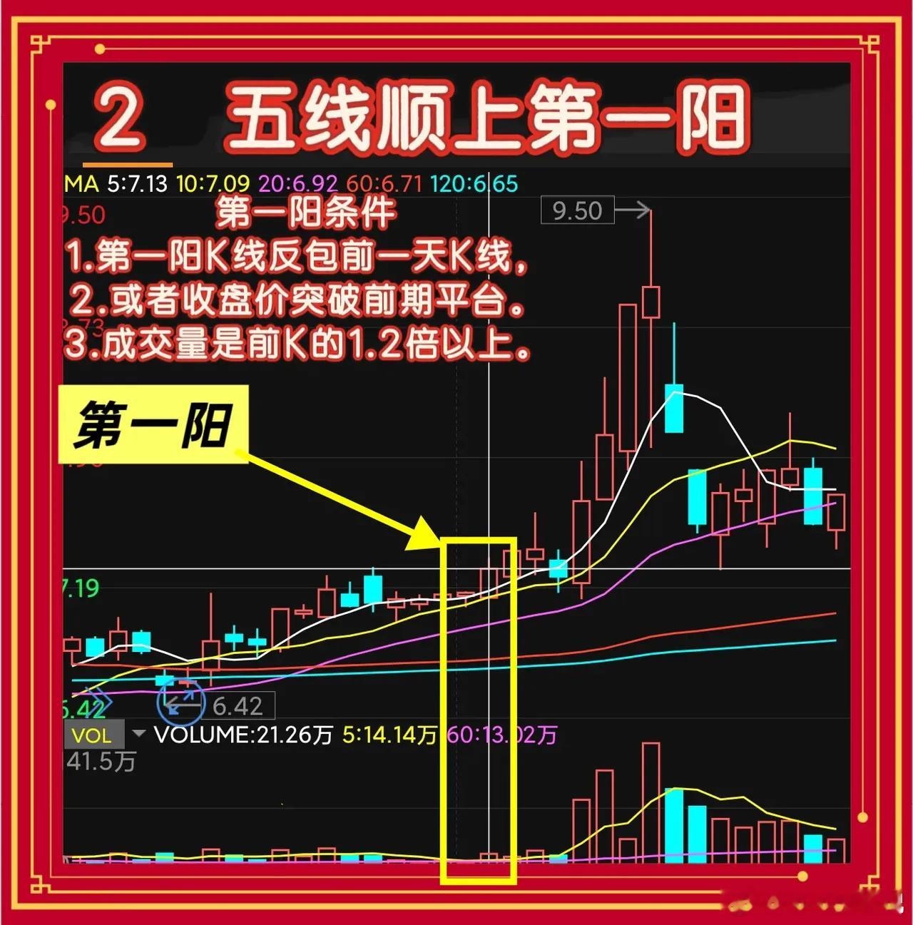 “五线顺上第一阳” 捕捉波段起涨点 “五线顺上第一阳买入法”是短线交易里捕捉趋势启动点的经典策略。其核心逻辑是依靠均线排列来确认趋势,再把首根放量阳线当作入场信号,兼顾了安全性与攻击性。首先,要明确“五线顺上”的核心前提。此处的五线指的是5日、10日、20日、60日、120日均线,需保证所有均线呈多头排列,也就是5日均线处于最上方,往下依次是10日、20日、60日、120日均线,并且所有均线都向上发散。这种排列表明短期、中期、长期资金成本逐步递增,市场做多共识清晰,趋势稳定性更高。其次,要精准识别“第一阳”的关键特征。在五线顺上形态形成之后,股价通常会经历一段缩量回调。当回调到5日或10日均线附近时,会出现一根放量阳线,这根阳线就是“第一阳”。这根阳线要满足两个条件:一是成交量相比前一日显著放大,至少达到前一日成交量的1.2倍以上,以此证明有资金主动进场;二是阳线实体要覆盖前一日K线实体,或者收盘价突破近期小平台高点,形成有效突破信号。最后,要严格执行入场与风控纪律。当“五线顺上”和“第一阳”信号同时出现时,可以在当日尾盘或次日开盘后择机入场;止损位设定在近期回调低点或10日均线下方,若股价跌破止损位,要立刻离场,避免趋势反转造成损失;止盈可以参考前期压力位,或者设置固定盈利比例,如10%-15%,根据市场走势灵活调整。这套方法的优势在于借助均线趋势过滤杂波,通过放量阳线确认资金动向,适合在震荡上行或单边上涨行情中运用。如果你觉得这套思路对你有帮助,不妨点赞收藏,方便后续反复研究;也欢迎在评论区分享你的使用心得,关注我获取更多实用交易技巧,一同提升交易判断力。本文仅供思路交流,不做投资推荐。股市有风险,入市需谨慎股票股市股票