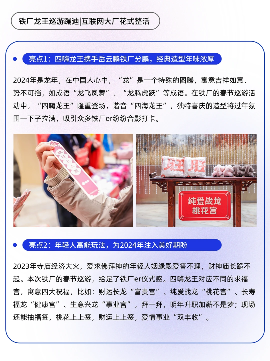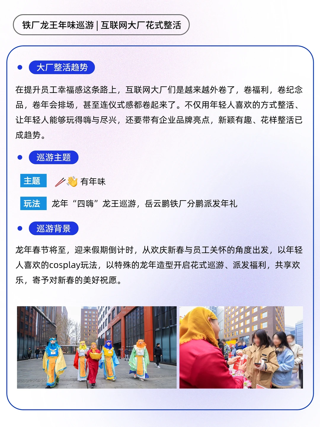 在提升员工幸福感这条路上,大厂们到底有多“卷”? 卷福利,卷纪念品,卷年会排场,甚至连仪式感都卷起来了!🤣 过年放假倒计时,不出意外,各大公司都会以一场年会收尾2023、展望2024。直到看了铁厂的春节巡游活动,不得不说一句,还得是互联网大厂会玩~[doge] 本次活动以“🥢👋有年味”为主题,在忙碌的工作之余,来一场放松的精神spa,现场热闹非凡,简直是e人天堂!😍 ✅亮点1:四嗨龙王携手岳云鹏铁厂分鹏,经典造型年味浓厚 2024年是龙年,在中国人心中,“龙”是一个特殊的图腾,寓意吉祥如意、势不可挡,如成语“龙飞凤舞”、“龙腾虎跃”等成语[烟花R] 在铁厂的春节巡游活动中,“四嗨龙王”隆重登场,谐音“四海龙王”,独特喜庆的造型将过年氛围一下子拉满,吸引众多铁厂er纷纷合影打卡。 岳云鹏作为🥢👋的官方代言人,这个长在大家笑点上的男人,虽然不能来到现场,但是岳云鹏铁厂分鹏,同样给打工人带来了无限欢乐,经典造型辨识度非常高,手捧金元宝派发新春礼物🎁 ✅亮点2:年轻人高能玩法,为2024年注入美好期盼 2023年寺庙经济大火,求佛拜神的年轻人姻缘殿爱答不理,财神庙长跪不起。本次铁厂的春节巡游,给足了铁厂er仪式感[赞R] 四嗨龙王对应不同的求福宫,寓意四大祝福,比如:财运长龙“富贵宫”、纯爱战龙“桃花宫”、长寿福龙“健康宫”、生意兴龙“事业宫”,拜一拜,明年升职加薪不是梦;现场还能抽福签,桃花上上签,财运上上签,爱情事业“双丰收”[大笑R] 不愧是互联网大厂,这次又开眼界了~👏🏻