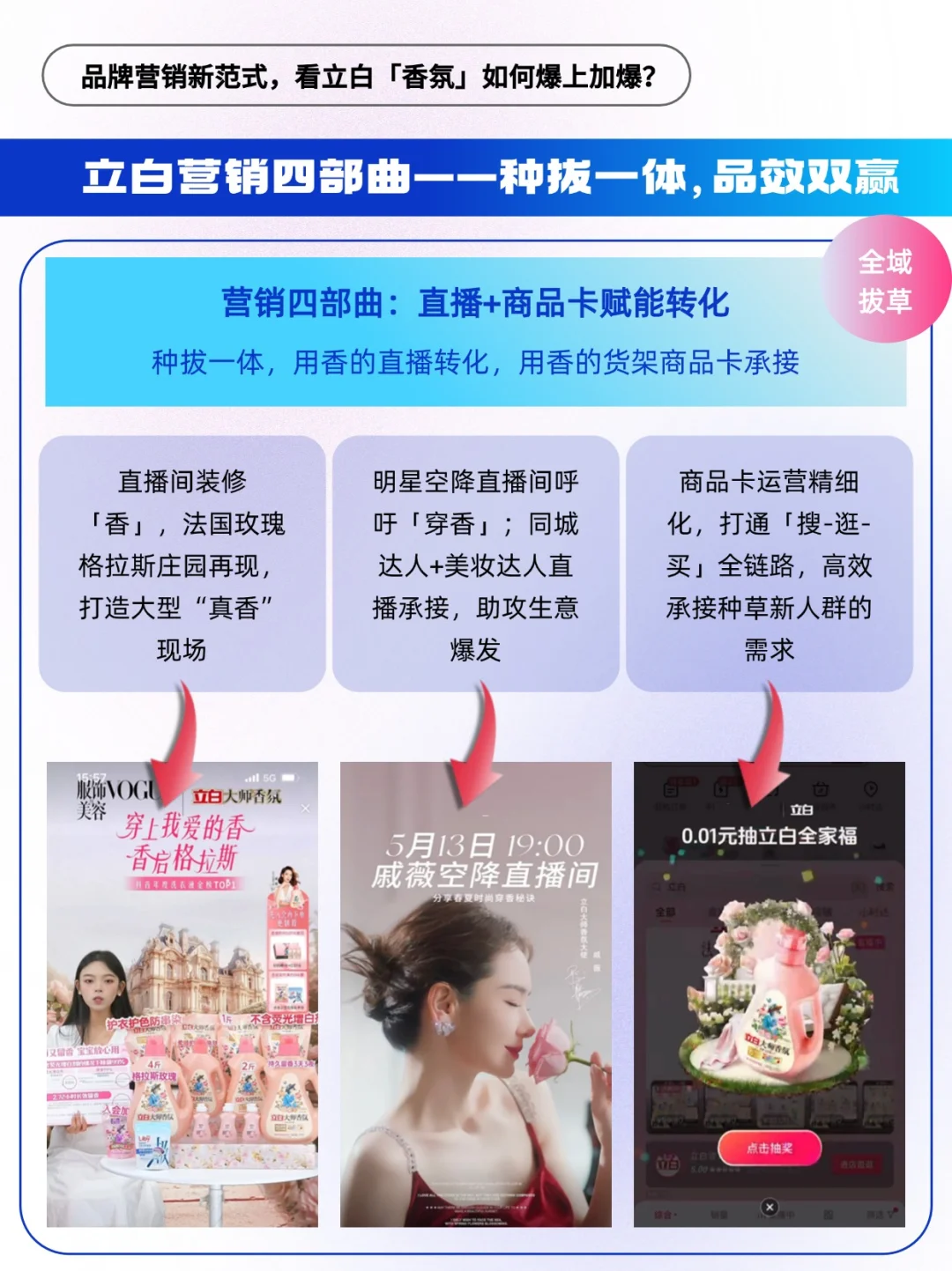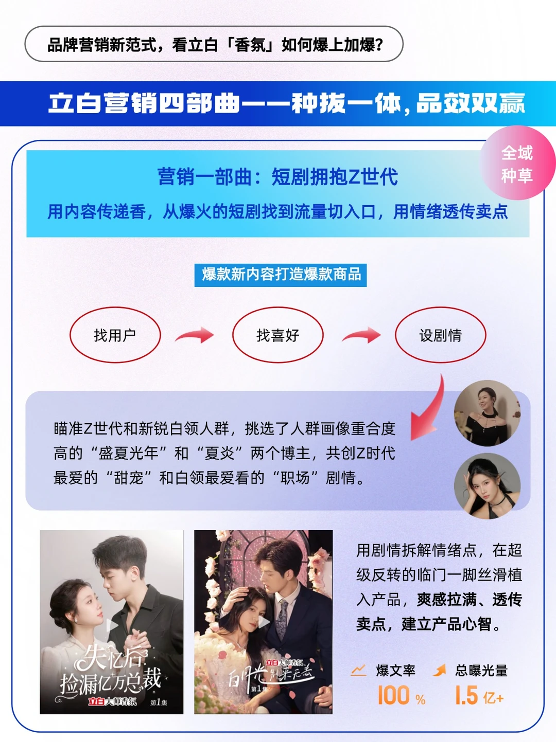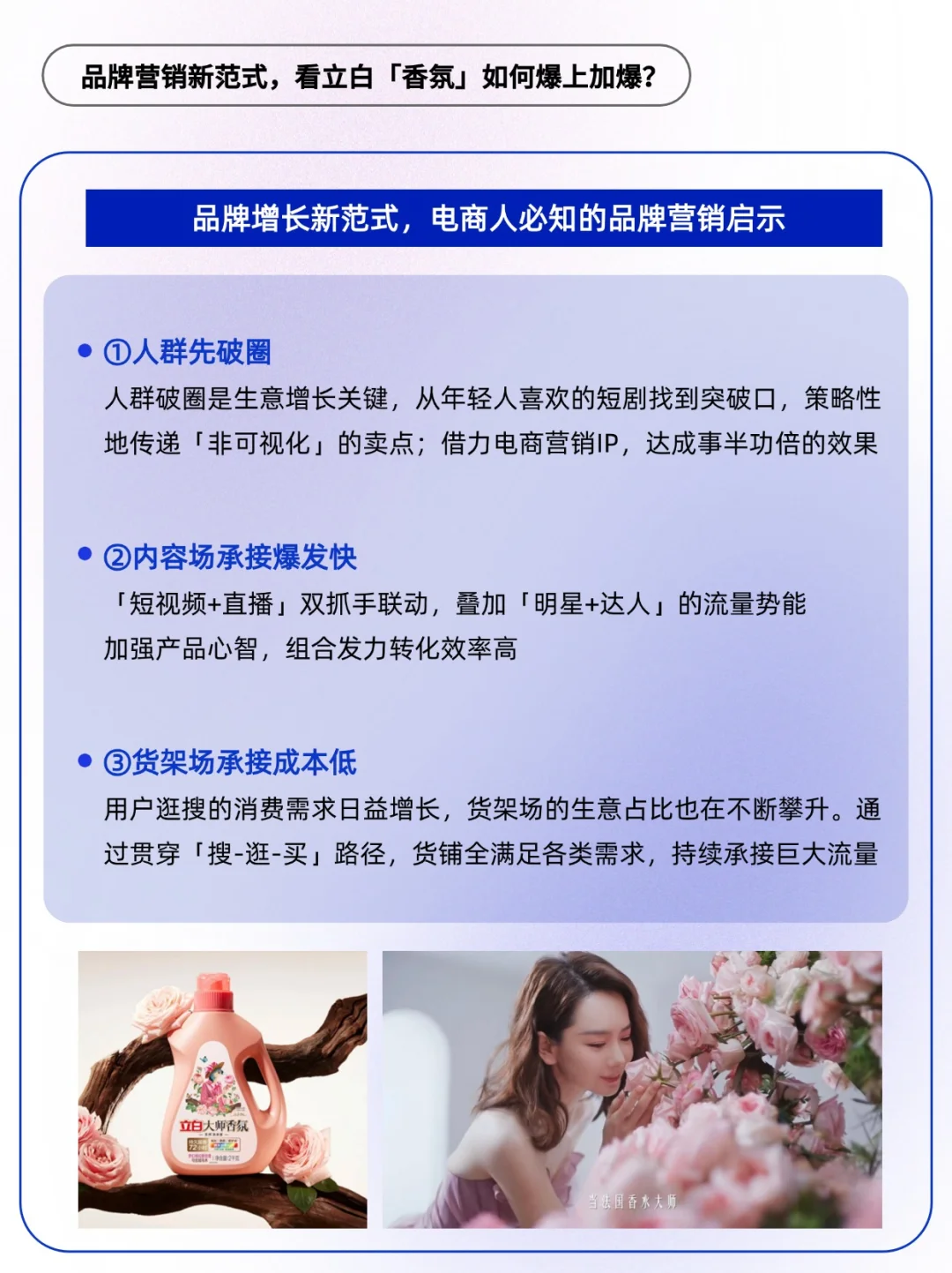 上回给大家拆解了林氏家居的电商案例,今天我们来讲讲另一个出圈品牌——立白。 当短剧营销如日中天,业内第[一R]个吃螃蟹的品牌,会有多香?立白「香氛」它果断下场了。 短短7天撬动5800万+GMV,引领行业Top[一R],背后它做对了什么? 入局短剧找到「年轻人群」,品牌大事件强力背书,明星+达人种草打造时尚感,让非可视化的「香」溢出屏幕。商品卡精细化运营,策略性地打通「搜-逛-买」全链路,实现种拔一体、品效合一[拔草R] 寻求生意增长,电商营销的创意玩法,这又是一个可以抄作业的典型案例。