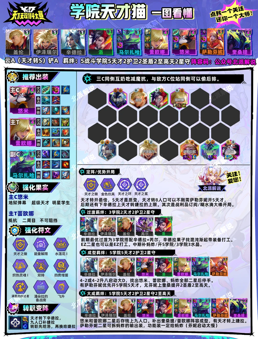 在一众阵容热补丁削弱后,以猫咪主C为构筑的5学院5天才阵容异军突起,无论是前四率还是平均排名都碾压水晶、95、法师,跻身第一梯队!