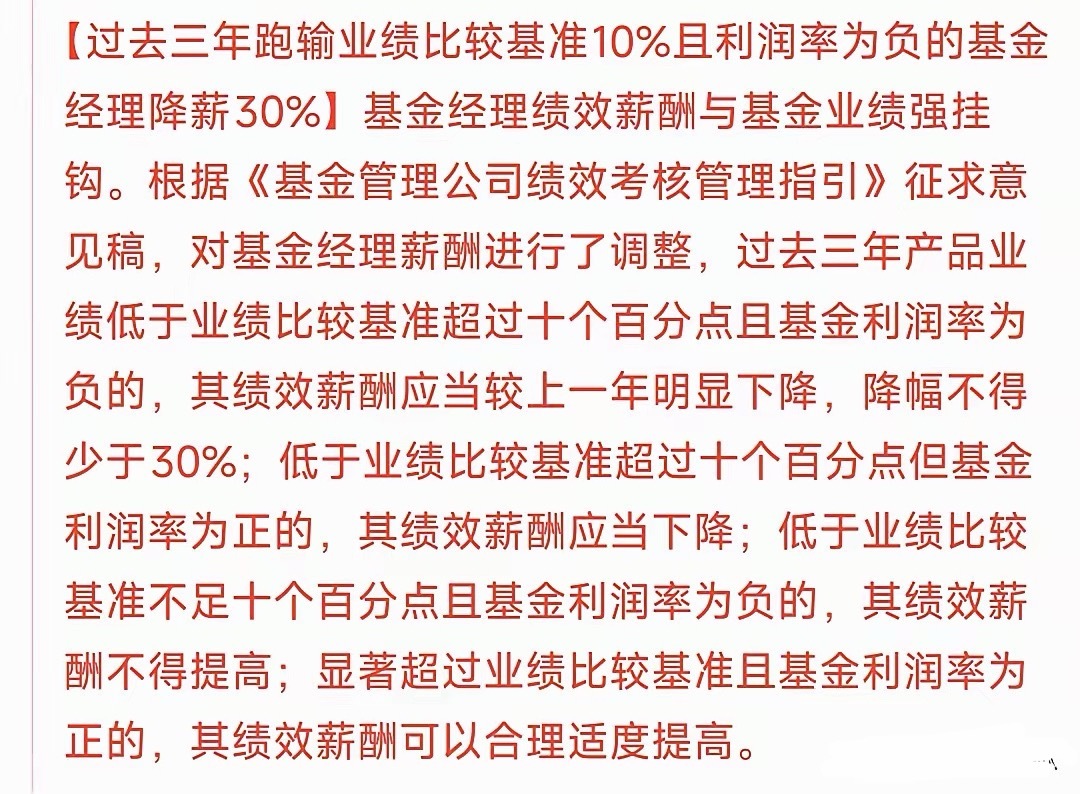 终于来了,基民终于等到了想要的消息,基金经理要看业绩吃饭了以前的基金就是靠基金的规模来赚,年终的时候不管涨跌,管理费照拿不误,一分也不会少,现在规则改了。最新规定:过去三年跑输业绩基准10%且业绩为负的,基金经理就要降薪30%。就是说:基金经理管的基金,要是连续3年没跑赢行业“参考线”,还亏了钱,而且落后幅度达到10%,那他的工资就会直接降30%。以后基金经理会更在意基金的涨跌幅,而不是一味的扩大规模,这样基民也会放心基金经理来买基金,而不是年底基金赔了大部分只能基民来扛风险。基民其实才是长线投资最多的资金提供者,这个新规有利于长期资金入市,可以很好的践行价值投资。