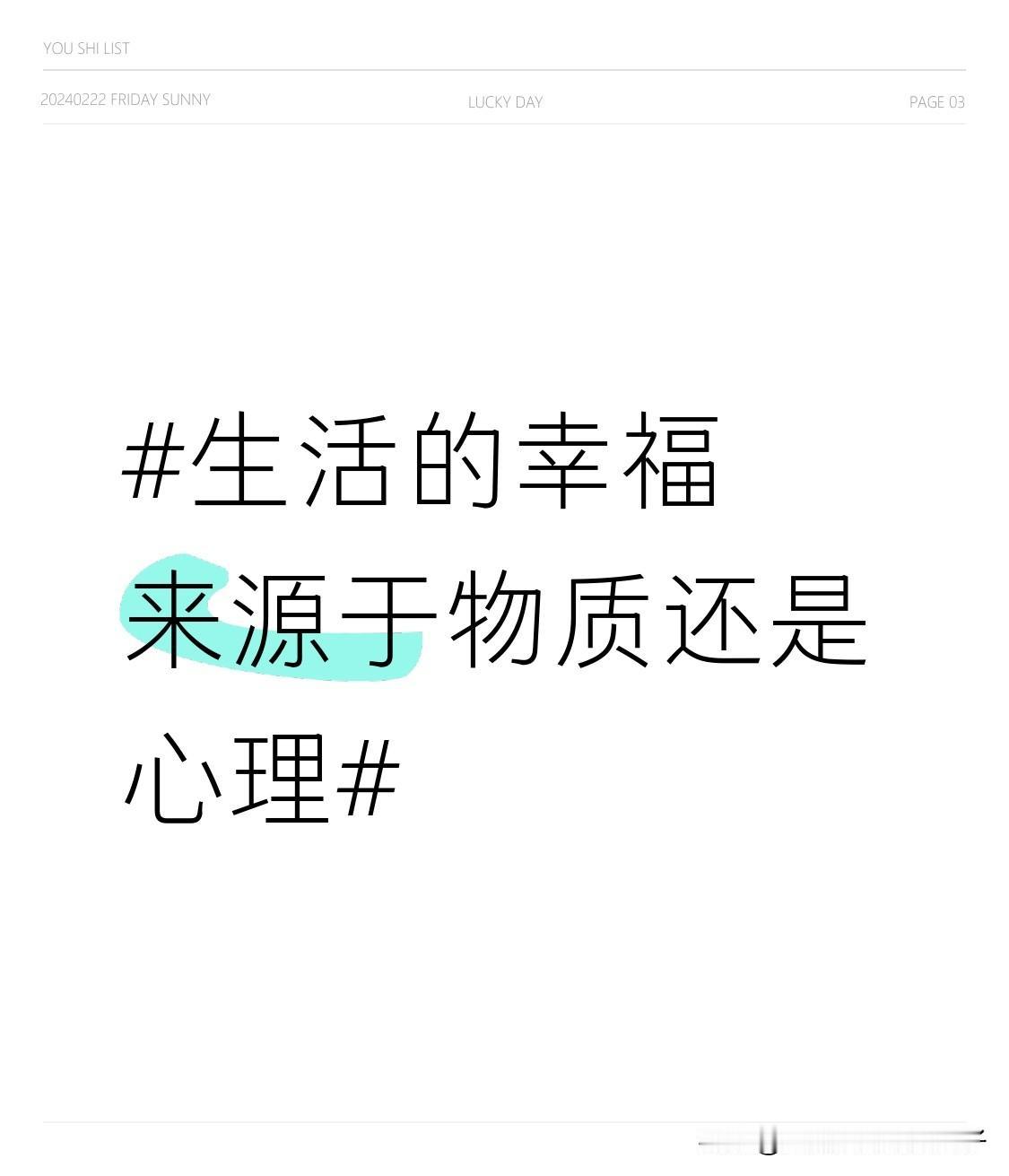 生活的幸福究竟来源于物质还是心理,这是个值得探讨的问题。有人觉得物质能带来幸福,像马云,财富让他享受顶级生活,约 30%的人也认为金钱满足物质需求就是幸福。但幸福绝不止于物质。 有个老人住简陋小院,种花养鸡、和邻居唠家常,脸上满是满足,他觉得家人平安、健康度日就是幸福。心理学专家也说,真正的幸福多源于精神满足。像颜回身居陋巷却不改其乐,苏轼被贬仍能心安。幸福更是一种付出,志愿者支教看到孩子进步,内心满是喜悦。所以,幸福更多是心理上的富足。