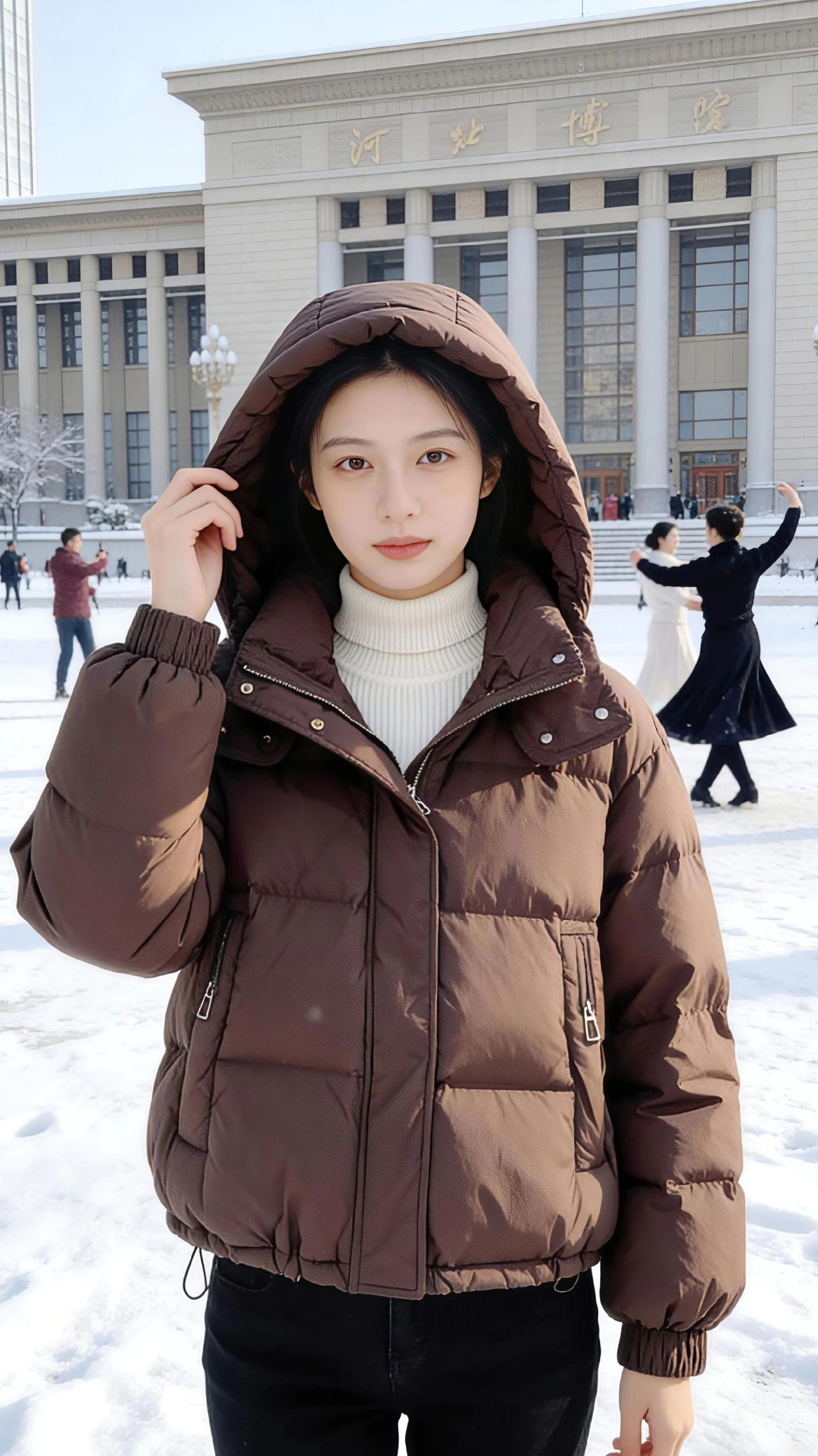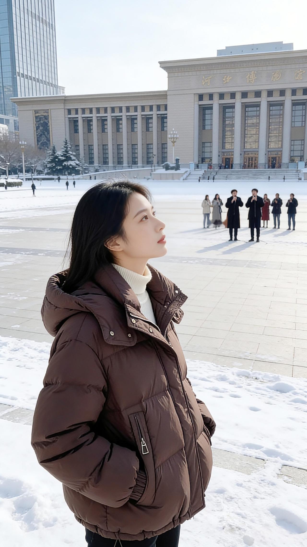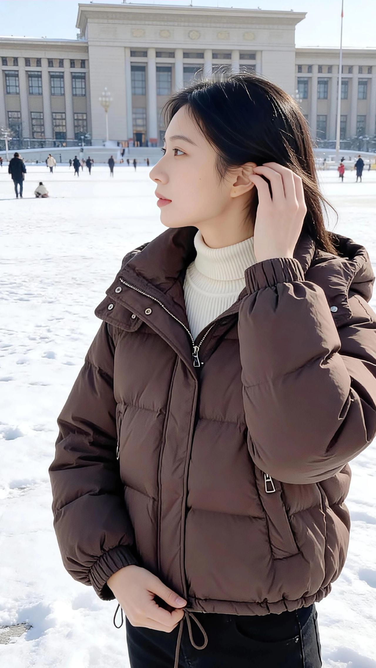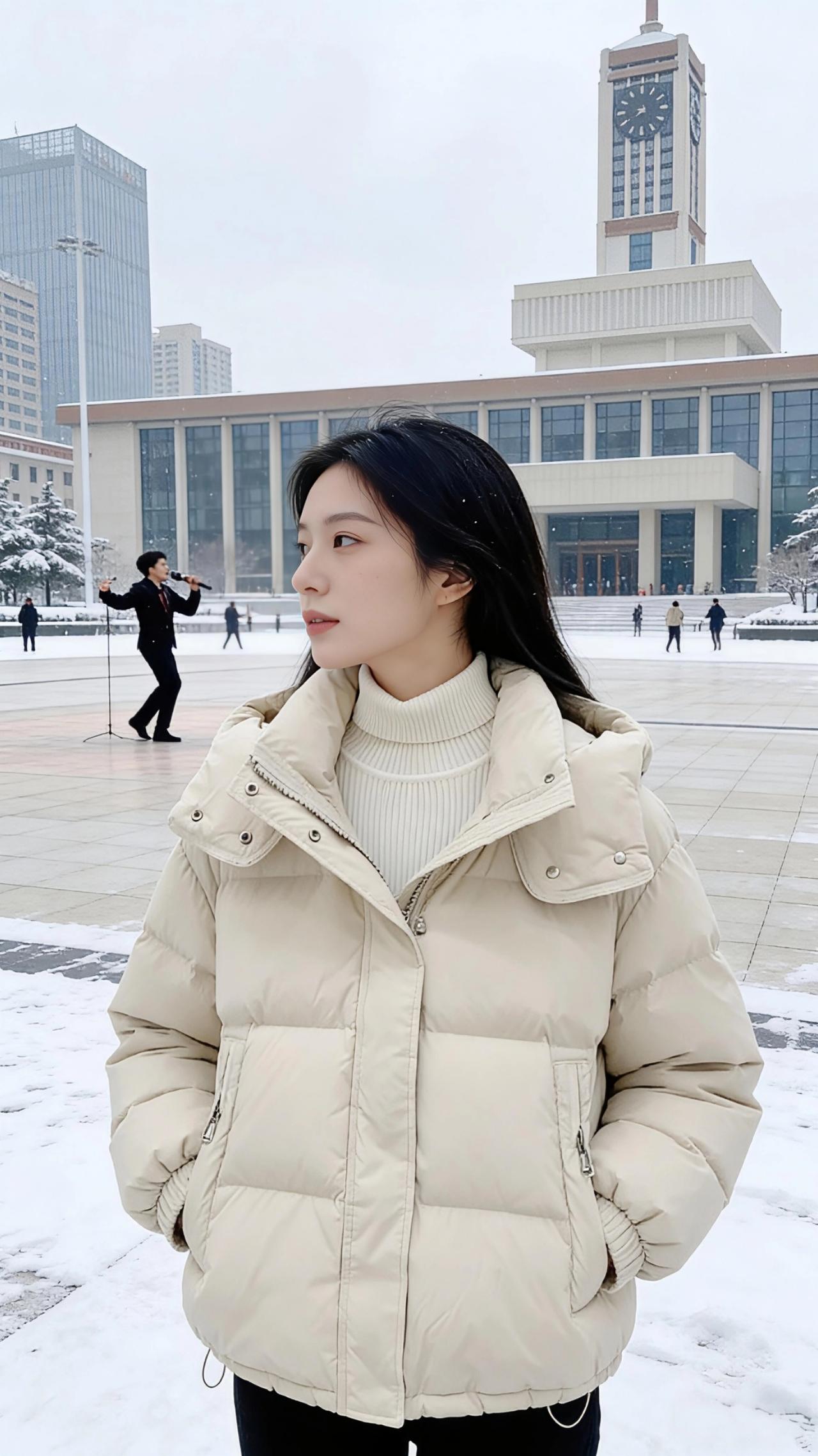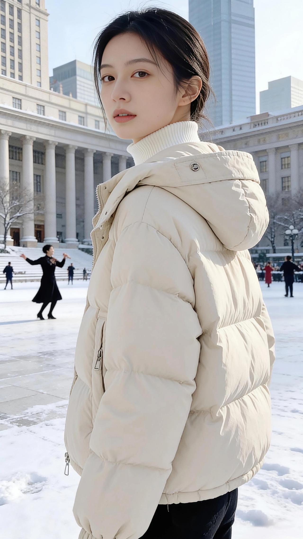 雪落时,她裹着米白的棉服立在广场中央。风把蓬松的帽檐吹得轻晃,毛领沾了星点碎雪,像落了层细糖。身后的建筑是浅褐的暖调,廊柱与窗棂浸在冬阳里,晕出软和的金边。 有人在远处拉小提琴,琴音像化了的雪沫子,沾在她竖起的衣领上。她抬手拢了拢袖口,指节蹭过绒绒的针织高领,那点暖顺着指尖漫到眉梢——于是她偏头笑了,掌心的雪团散作细屑,混着光斑落进发梢。 广场的雪是静的,只有裙摆扫过雪地的窸窣,和音符撞在建筑檐角的轻响。她把棉服的抽绳轻轻一扯,蓬松的衣摆裹住膝头,像把整季的温柔都拢在了怀里。风过时,连建筑的影子都软了,和她的笑一起,浸在这雪天的慢里。 高级感穿搭 小个子穿搭 冬季穿搭 棉服