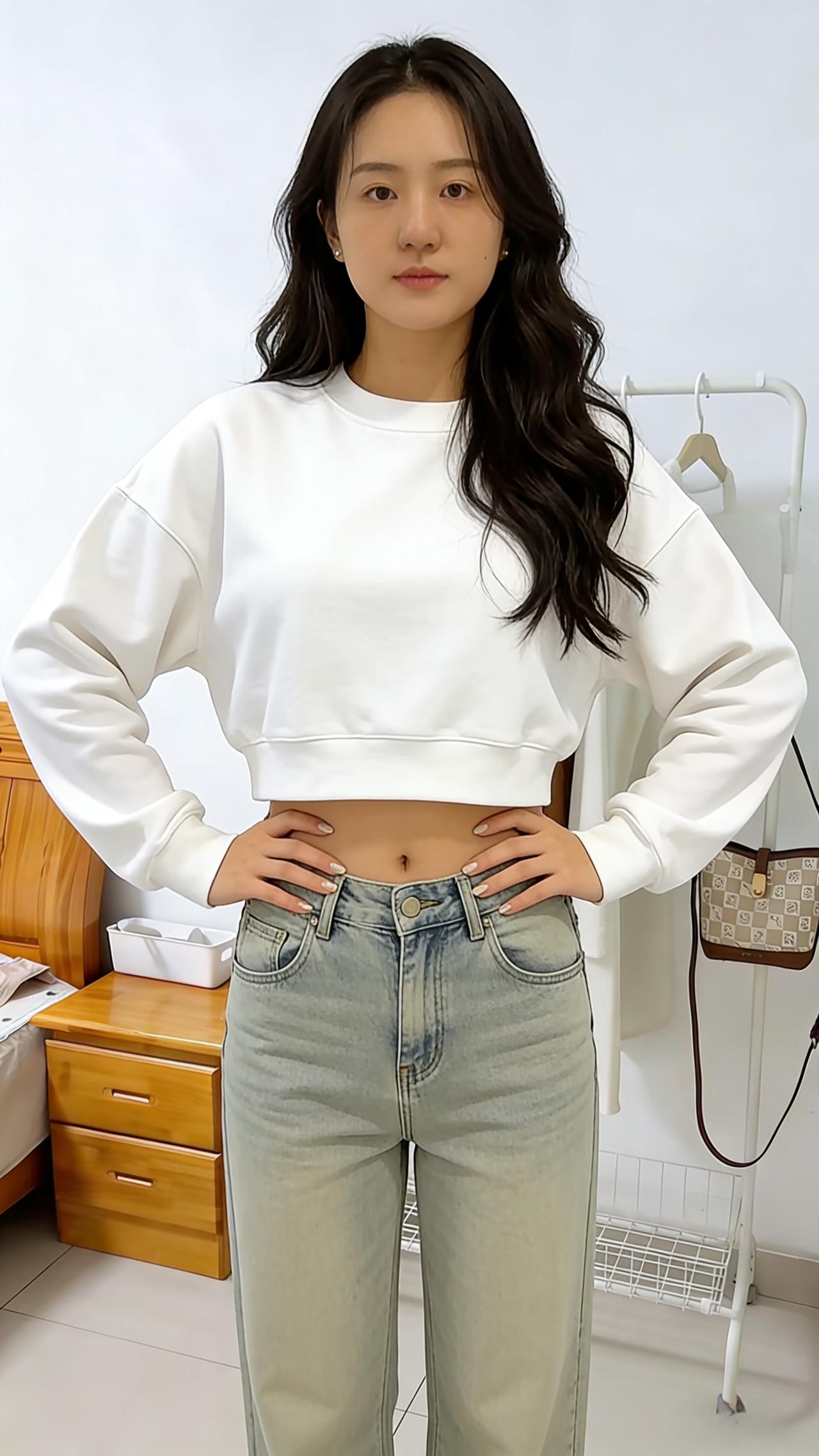 素室凝晨色,佳人立镜前。 牛仔缚玉骨,卫衣塑芊肩。 发垂流云影,眸含静水烟。 身姿如柳软,气韵若松坚。 室中藏雅意,眉底见清欢。 不借胭脂色,天然自娟娟。