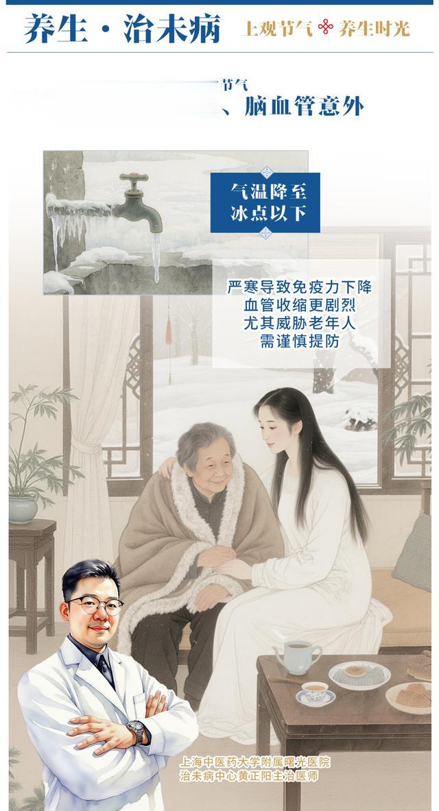 大雪节气要重点防肺炎、脑血管意外。气温降至冰点以下,严寒导致免疫力下降,血管收缩更剧烈,尤其威胁老年人,需谨慎提防。