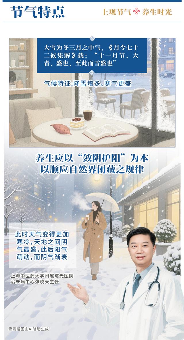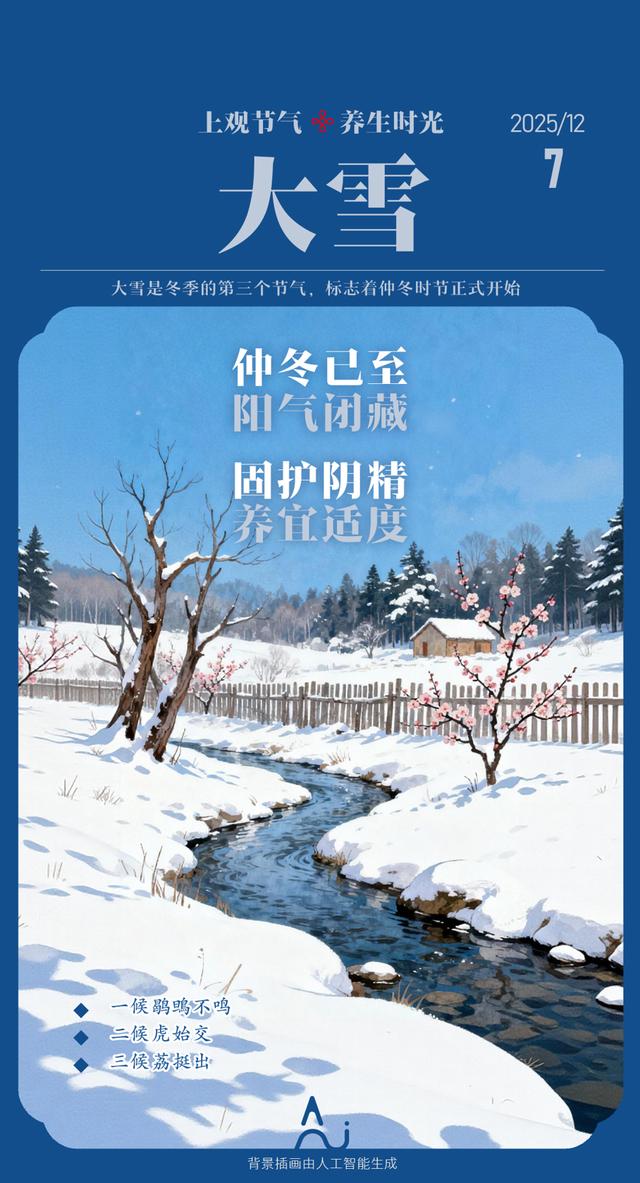 大雪为冬三月之中气,《月令七十二候集解》载:“十一月节,大者,盛也,至此而雪盛也”,点明其降雪增多、寒气更盛的气候特征,中医经典则围绕“阳气闭藏”核心,阐述其养生要义。