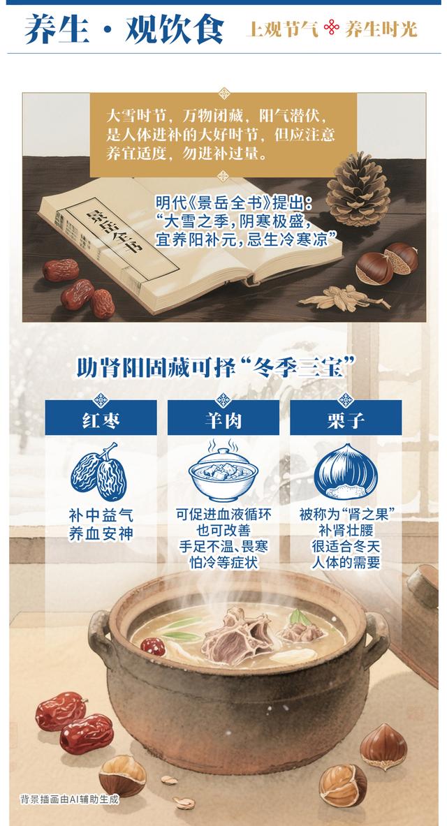 大雪时节,积雪冰封,万物闭藏,阳气潜伏,是人体进补的大好时节,但应注意养宜适度,勿进补过量。明代《景岳全书》提出:“大雪之季,阴寒极盛,宜养阳补元,忌生冷寒凉”,建议饮食以温补为主。可以选择羊肉、桂圆、栗子等。