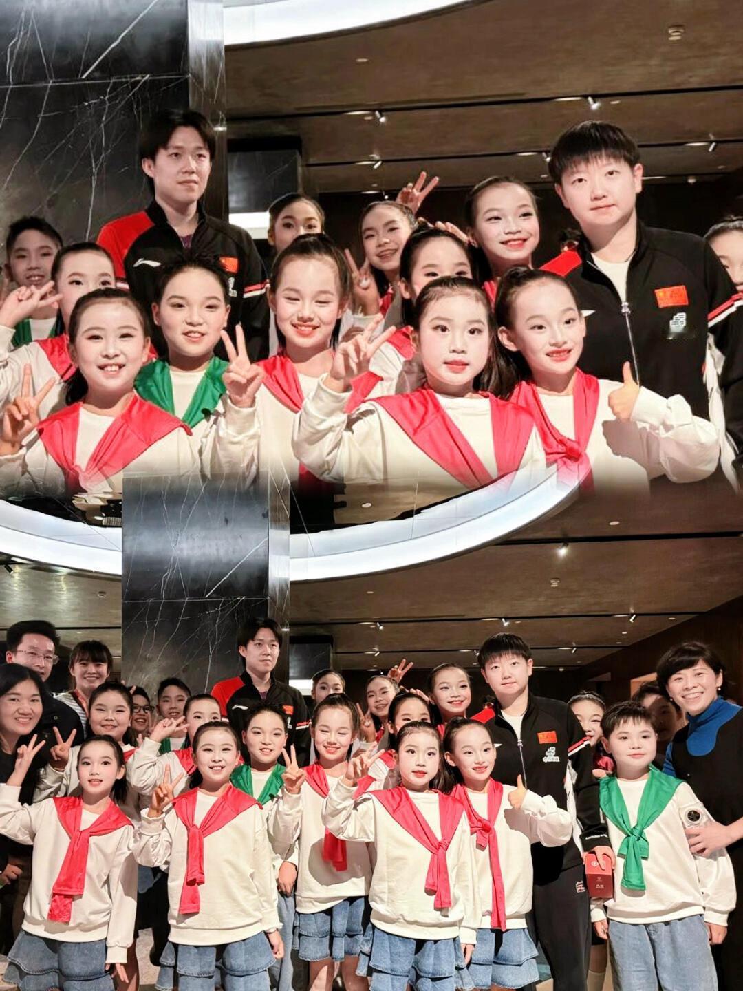 楚钦和莎莎没站在一起,但是眼神的方向,在偏向! 莎莎好像就是小朋友,圆圆的脸,心思很单纯,小朋友们都好开心,知道是和很厉害的人合影,但是知道是世界冠军和奥运冠军吗? 王楚钦也是一直被小孩子喜欢,喜欢这样的大哥哥和大姐姐,他们俩个小孩子一点不突兀,真的好和谐,超级喜欢这个样子!