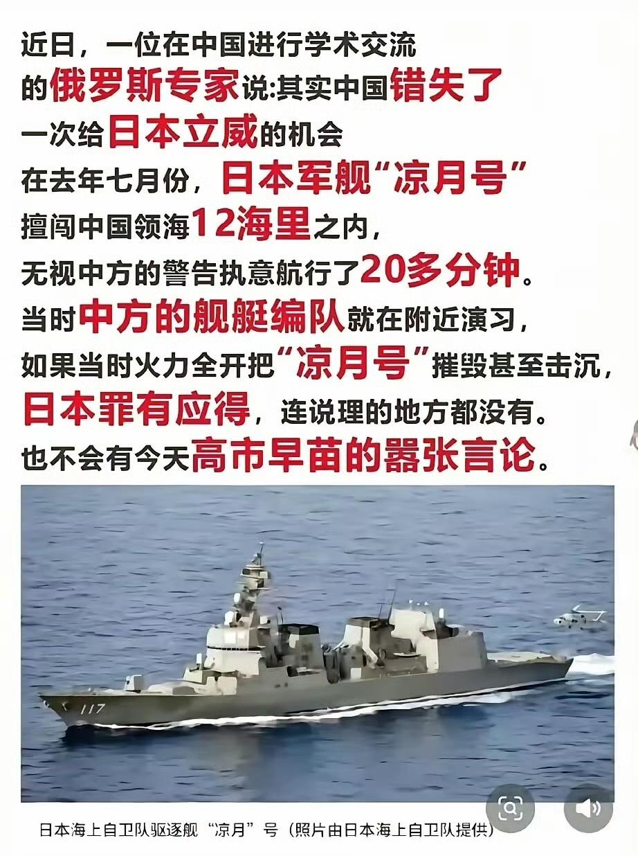 如果当时打掉“凉月号”,高市早苗还敢说台湾有事就是日本生存危机吗?还是说,台湾没事,日本先有事了?你认为,如果中日那时候来一场台海海战,现在是个什么场景!是不是已经打到东京了?红旗插到了富士山?