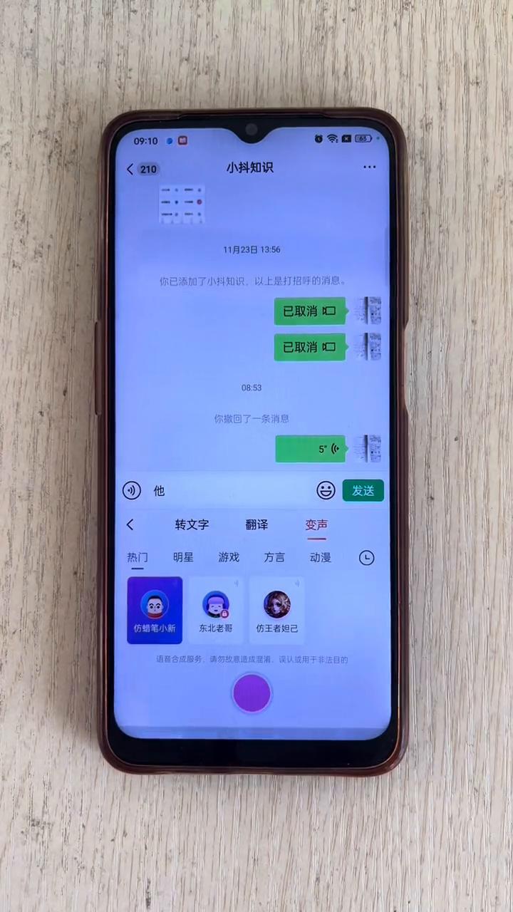 微信发语音消息可以变声了。 微信发语音消息也可以变声了,你们知道这个是怎么玩的吗?我给大家听一下,这个是我刚刚发的语音小抖知识。今天给大家拍一个微信变声的视频,这个就是蜡笔小新的声音。当然还有很多其他类型的,比如像明星的、方言的、游戏的等等,你喜欢什么声音它上面全都有。我已经测试过了,想学的朋友我现在教你怎么操作的。 ·打开自己的微信,随便找一个跟你朋友的聊天框就可以了。这个操作是怎么来的?看这里,点开这个小键盘,中间这里有个小话筒,点开它看到变声了吗?点到这个变声上来,这里有蜡笔小新的东北老哥、仿王者妲己、明星的游戏方言等等,你都可以自己选。 举个例子就行,使用方法都一样,直接选蜡笔小新就默认它就行了。直接点一下下方发送语音的按钮,你是一个超级无敌大坏蛋。大家听到这个声音了,这个就是蜡笔小新的声音。 ·输入完成之后这里有一个发送点,发送的时候注意要看,这里有显示的,两步发送变声。第一步点这里,点完之后直接按住说话,它就按住后一秒后自动播放变声,来听一下,你是一个超级无敌大坏蛋。这样就给对方发过去了,来听一下你是一个超级无敌大坏蛋。方法就这么简单。 ·有些朋友说我怎么找不到这个地方的一个小键小话筒?这个小键盘看着好像跟我的不太一样,那怎么办的?这个输入法其实是在这,你去找一下它,没有的话去下一个,下好之后使用它,你就可以发送变声语音了。 学会了吗?以上的方法大家学会了吧,跟着视频操作一下。有什么不懂的评论区留言,关注我小抖知识的干货都很硬核。